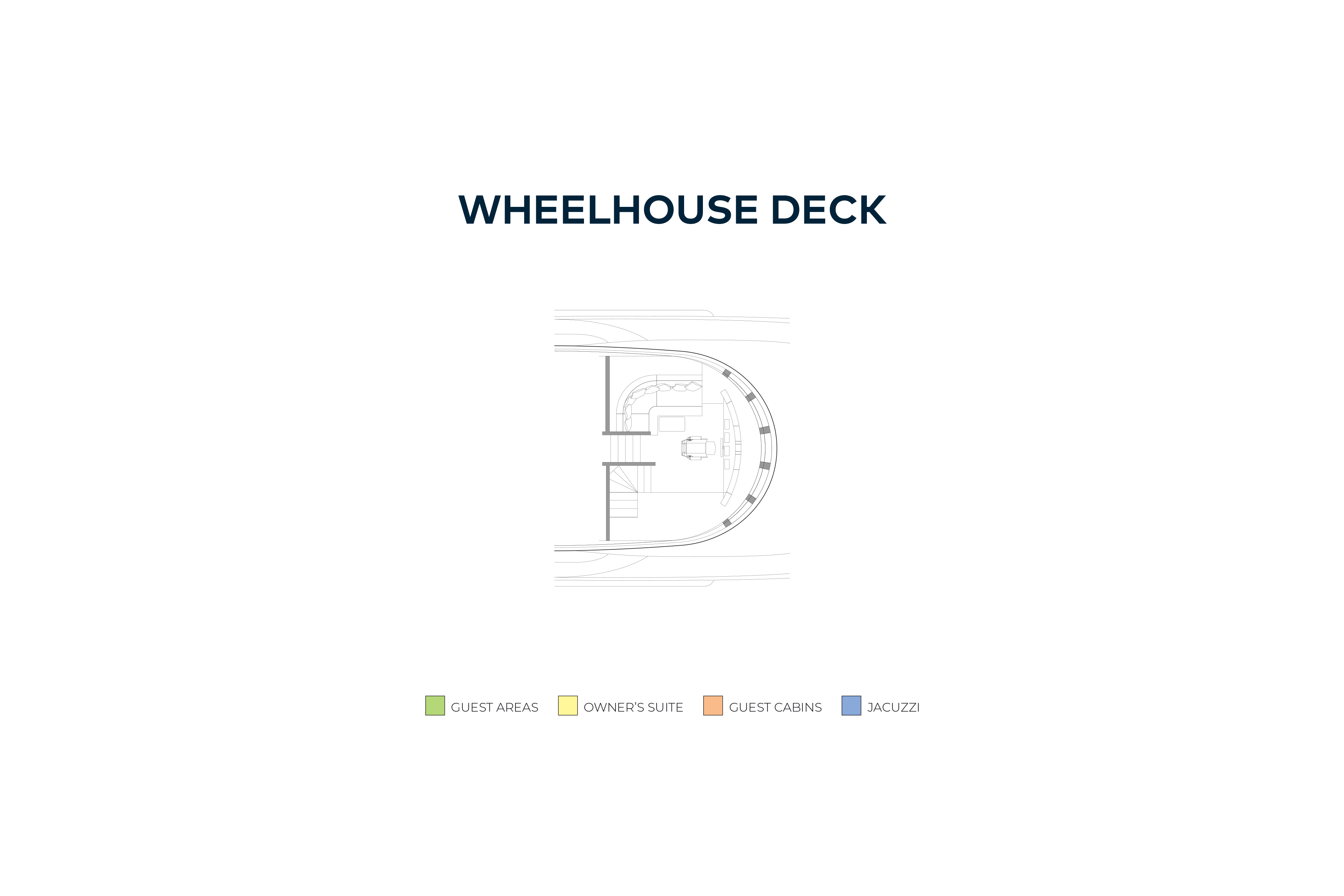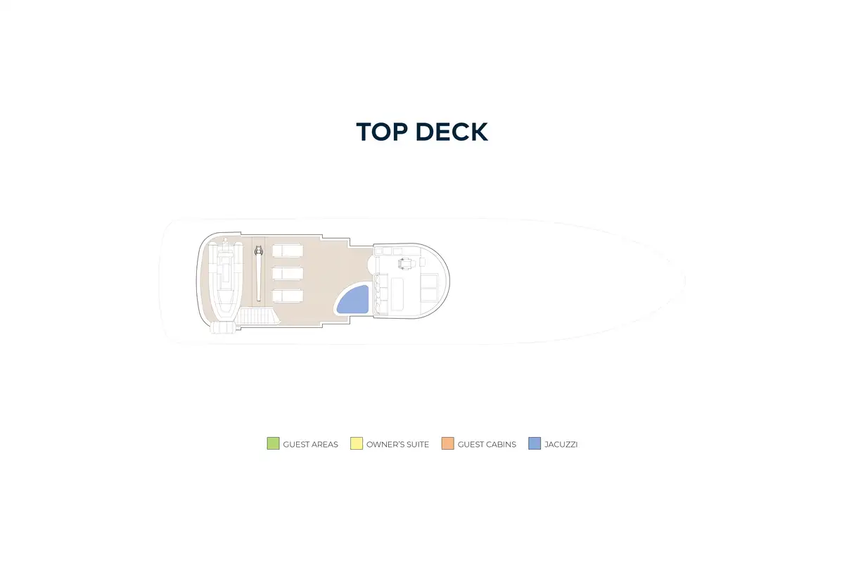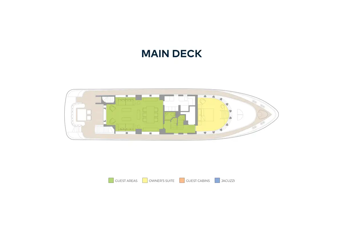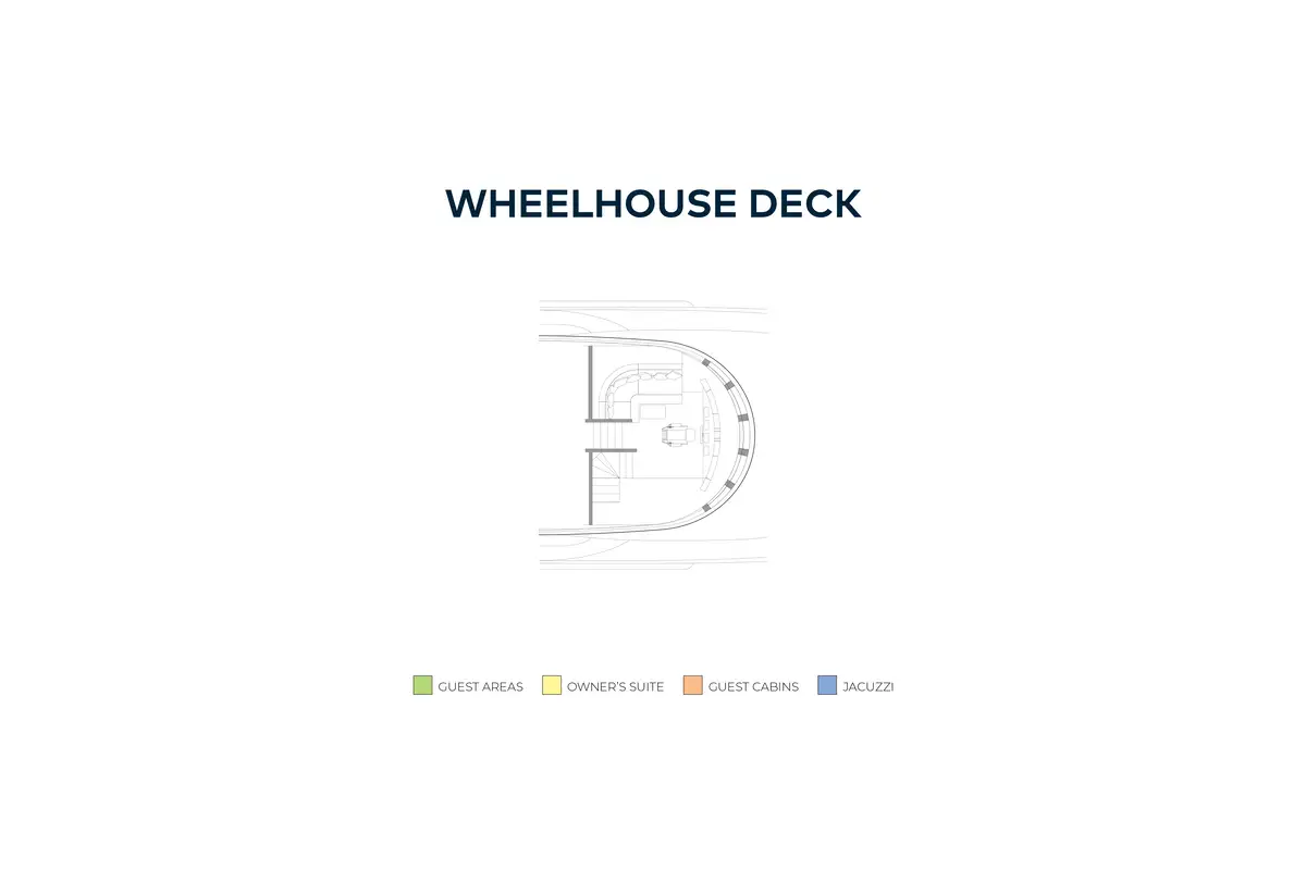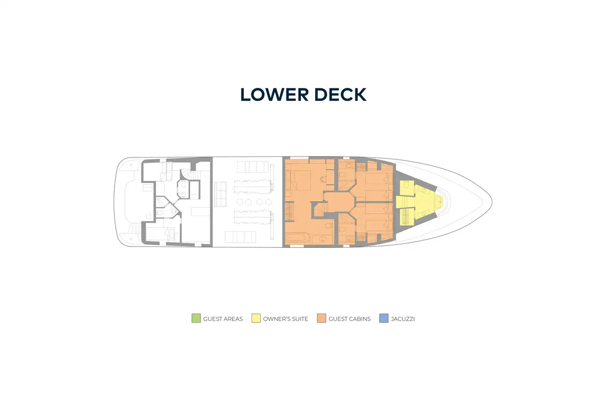 The split-level owner's suite, forward on the main deck, has wraparound windows that offer 180-degree views and steps lead down to a luxuriously appointed bathroom forward. On the lower deck there is a full-beam VIP suite with a full-size bath and two twin cabins (all en suite) can be found on the lower deck.