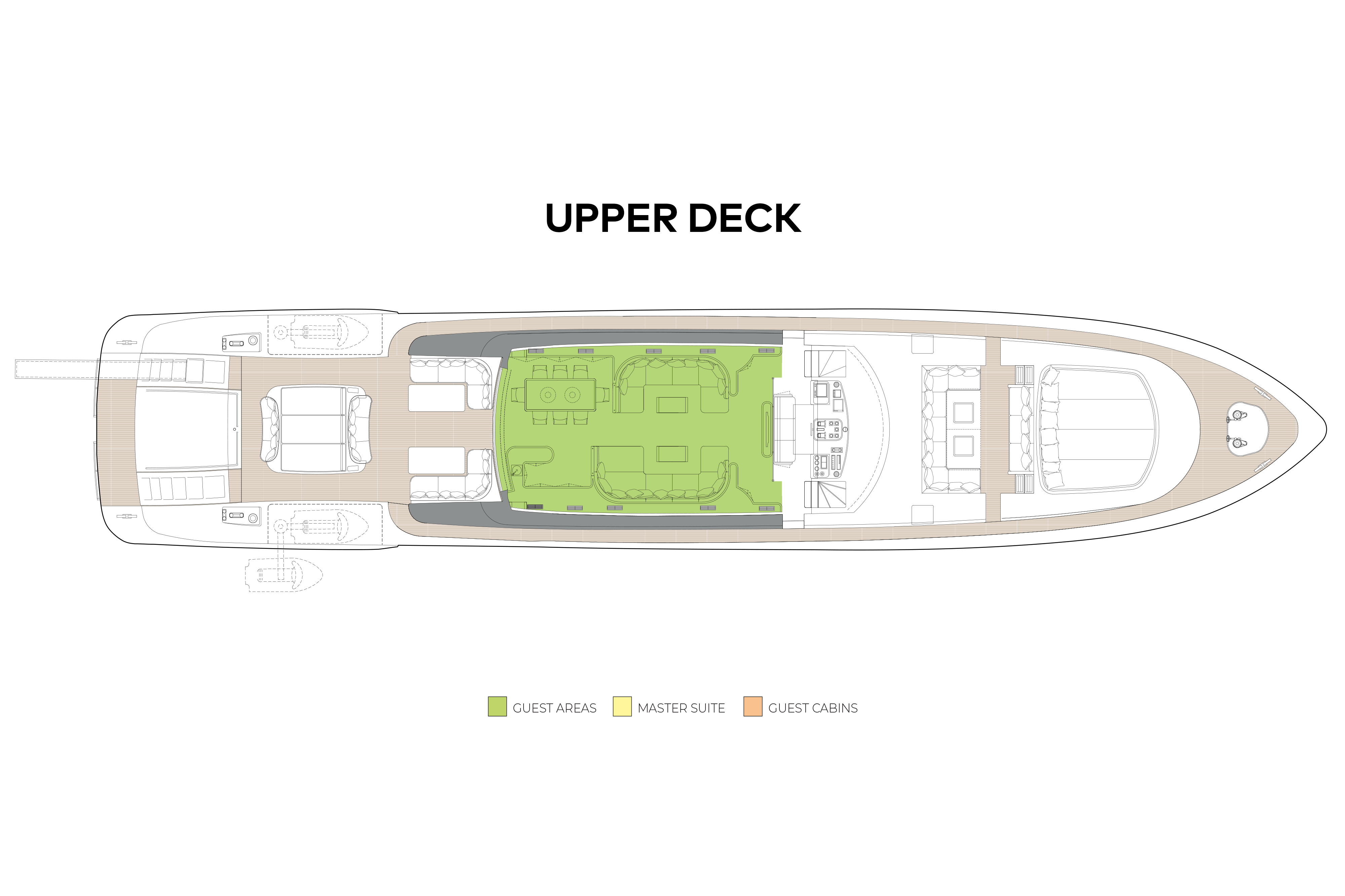 The foredeck has a huge sunpad, aft of which is an open-air dining area with optional shade from awnings. Walkaround sidedecks lead aft to a lounge with two L-shaped banquettes shaded by the overhang and a large sunpad that can convert into a jacuzzi.