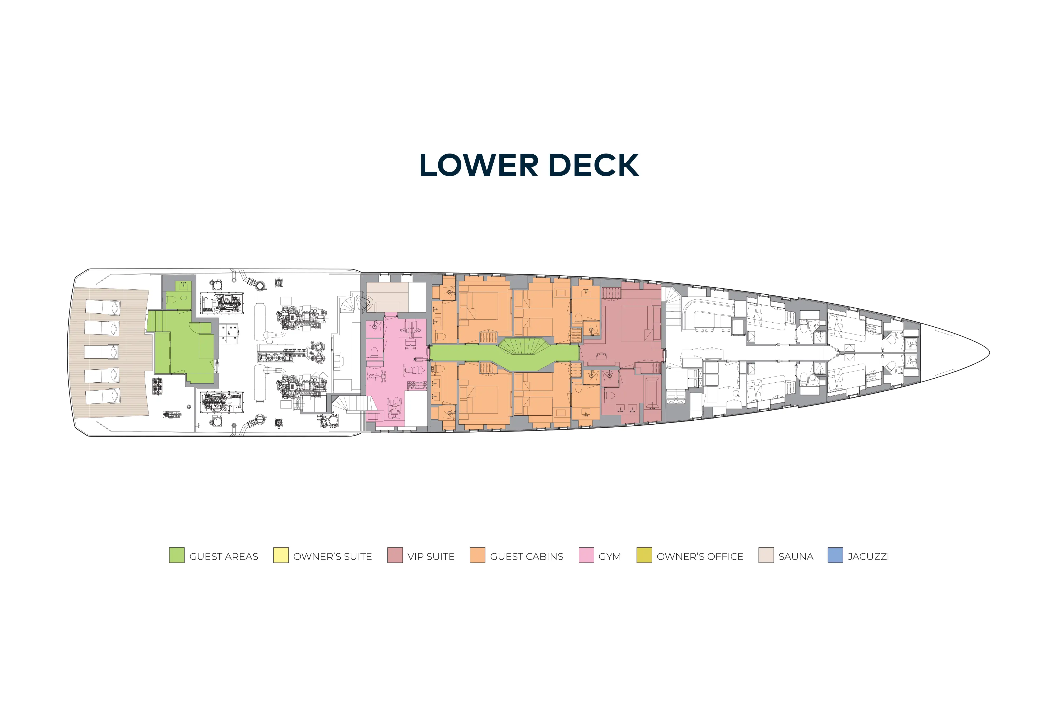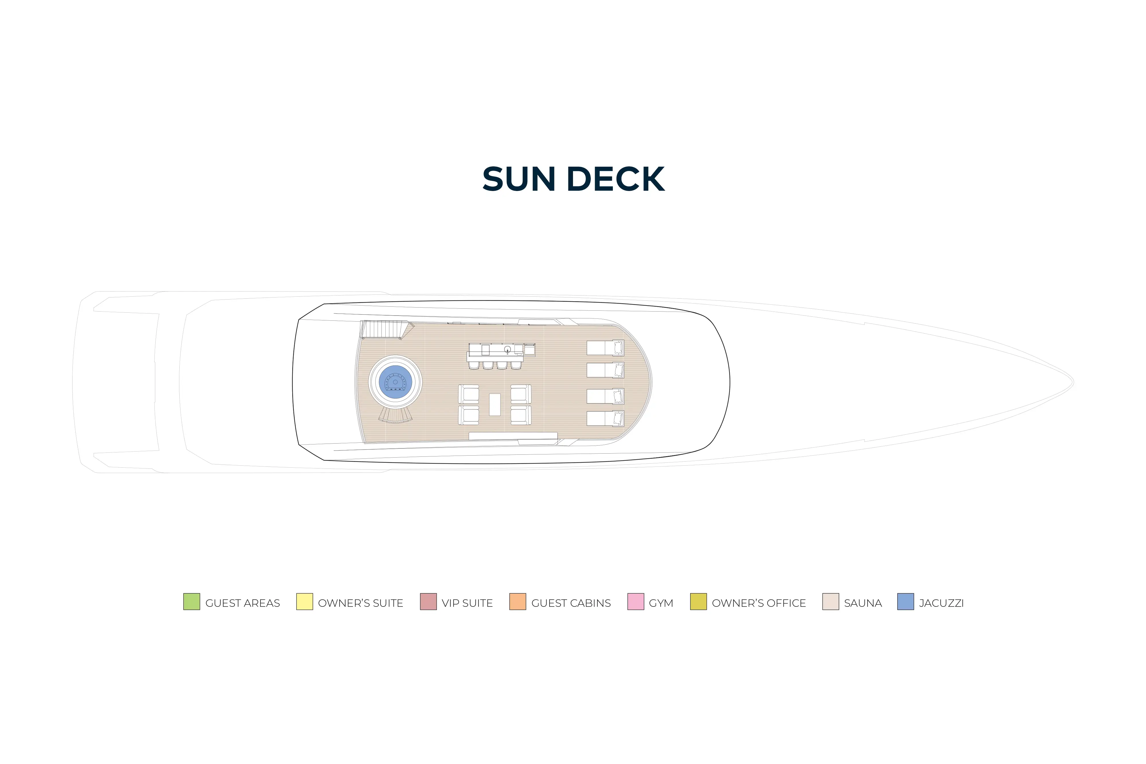 A large sun deck has sun loungers forward with privacy glass safety screens. Beneath the hardtop is a large sit-up bar to port and a lounge area to starboard, which could convert into a dining area. Aft is a jacuzzi. The upper deck aft has open air dining shaded by the overhang and a sun lounge aft, and walkaround sidedecks lead to the foredeck. The main deck aft has L-shaped banquettes port and starboard around coffee tables and a central staircase leads down to a huge swim platform that doubles as a sea level sun lounge. Behind a door, steps lead to an air conditioned gym and dayhead.