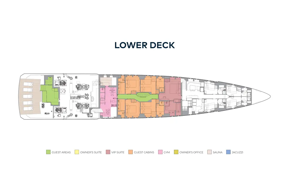 The full beam main deck owner's suite also features full height windows for incredible views and natural light at anchor. The suite has has a dressing room, en suite with shower, and a private office. On the lower deck a full beam VIP cabin, two double cabins and two twin cabins complete family friendly accommodation for 12 guests in six cabins. She also sleep up to 10 crew.