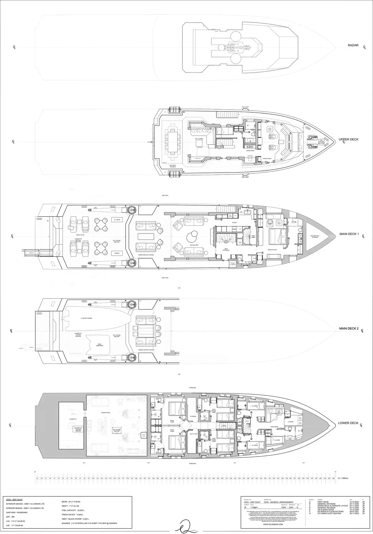 Twin Caterpillar C18 ACERT engines give her a top speed of 14.5 knots, a cruising speed of 12 knots and a maximum range of 3,000nm at 9 knots. CMC Marine stabilisers ensure guest comfort underway and at anchor.
