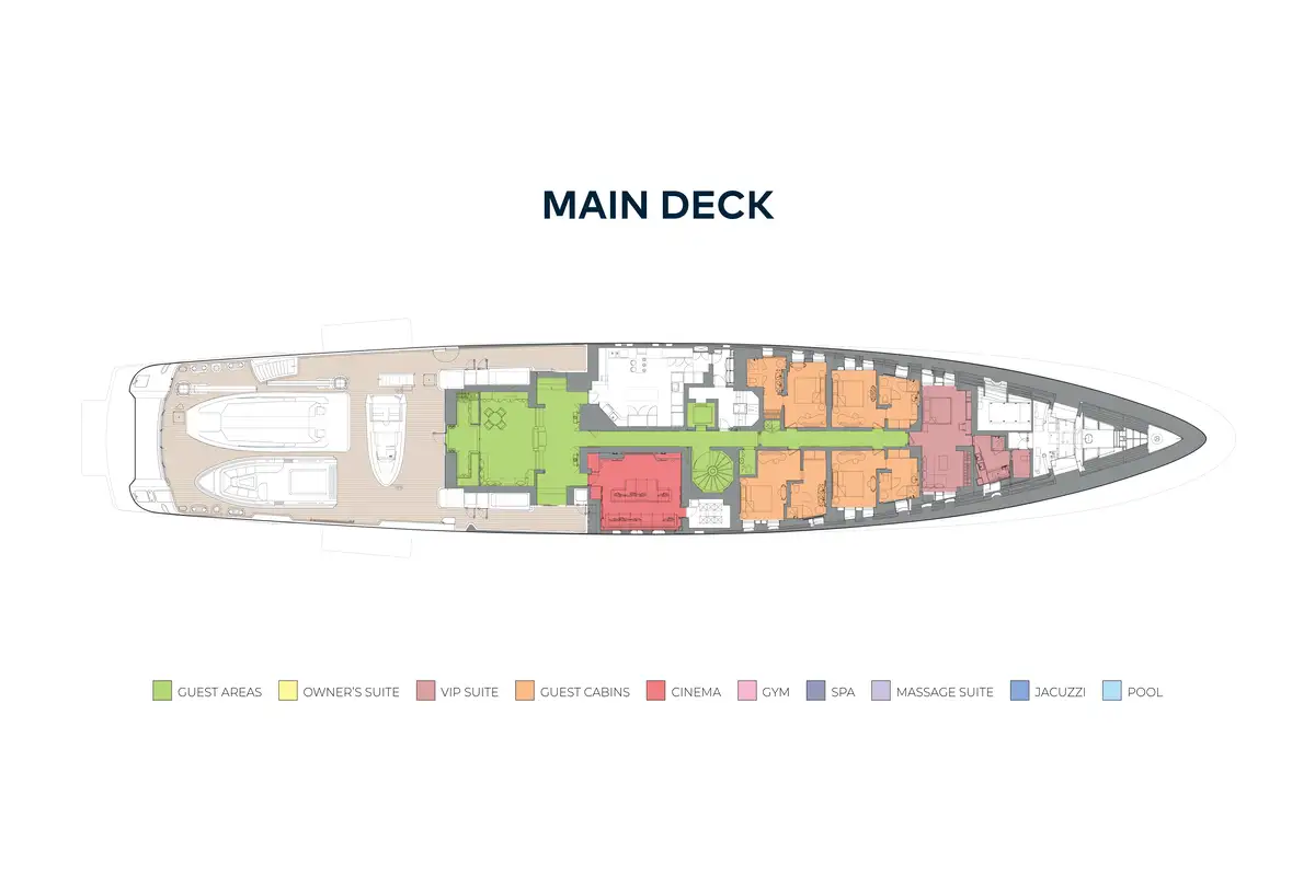 The main deck has a children's playroom, a tiered cinema and five further guest suites forward including a full-beam VIP suite with a private lounge. The main deck aft is a huge space dedicated to stowage for three of the yachts four tenders these include a 12m (39.3ft) custom-built aluminium catamaran limo/beach-lander, a 11.5m sportfishing Fountain 38 and a 8m (26ft) Nordkapp RIB. There is also enclosed stowage for her collection of watertoys. With the tenders launched, this space has potential for a range of guest activities.