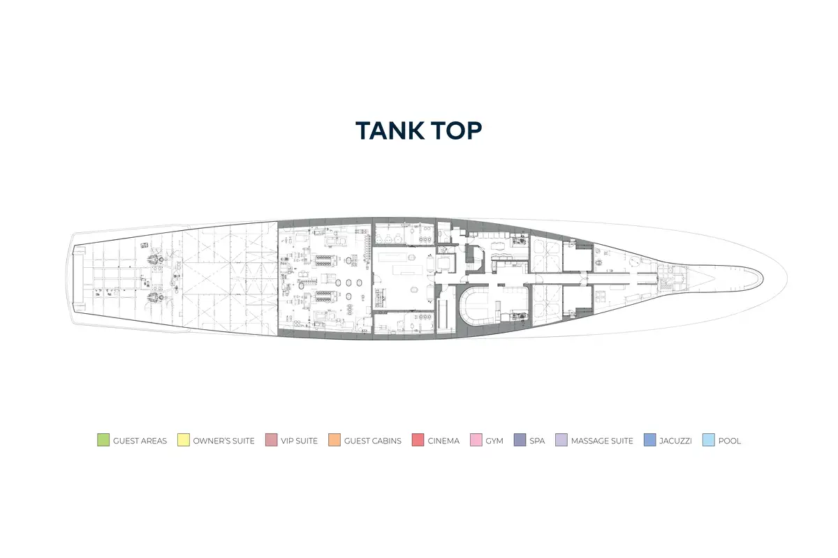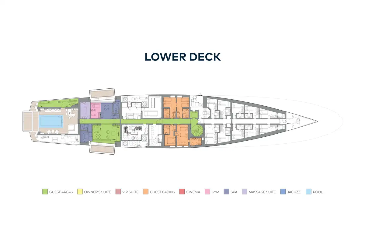 She has an extraordinary list of features. On the lower deck is a 200sqm (2,153sqft) beach club and wellness centre with a large pool, two lounge and bar areas, sea terraces port and starboard, dedicated gym, massage and treatment room, hammam and beauty salon. Also on the lower deck are double and twin cabins for guests, children or staff. There is step-free access to an elevator serving lower to bridge decks.