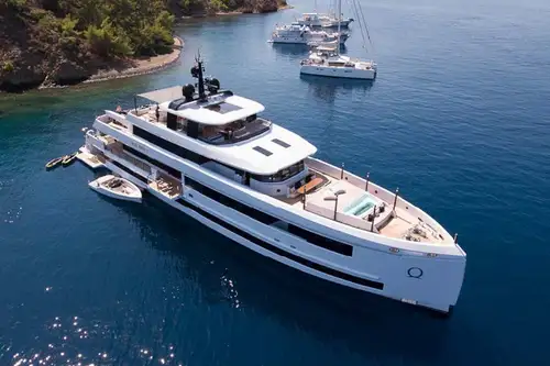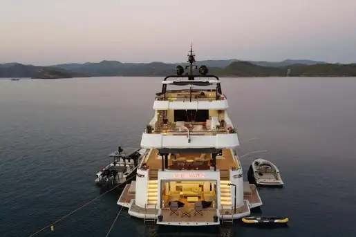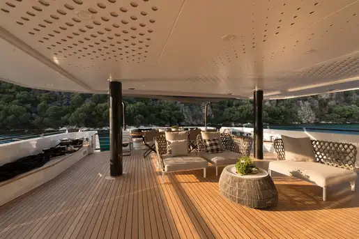 She offers a wide range of outdoor spaces, from the large foredeck lounge with two separate seating areas, a big jacuzzi pool and quadruple sunpad to the elevated sundeck with ample shade, the spacious main deck aft with its stylish lounge and dining areas, the sociable upper aft deck, the fold-out balcony terraces on both sides of the main deck saloon, and the pair of sea-level platforms that fold down on the port and starboard sides of the beach club. The master suite also has its own private outdoor terrace.