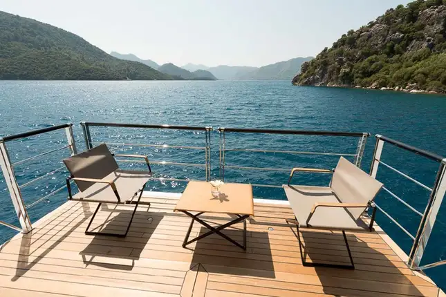 All of the guest cabins on board are generously sized and their en suite bathrooms have a marble finish. The master suite, which occupies the forward end of the main deck, includes a separate office and a TV/cinema setup with a projector screen and double glass doors that lead out onto its private balcony. What better way to start your day on holiday than to step outside and breathe the warm sea air?