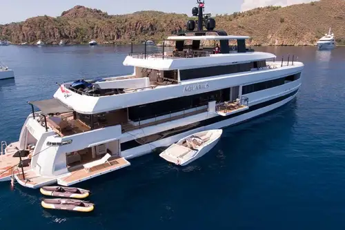 The 46-metre (150ft) AQUARIUS is packed with innovative features. Designed to host up to 10 overnight guests in five cabins with a crew of nine, this striking tri-deck yacht is an excellent choice for a charter holiday with family or friends on the azure blue waters of the Mediterranean.