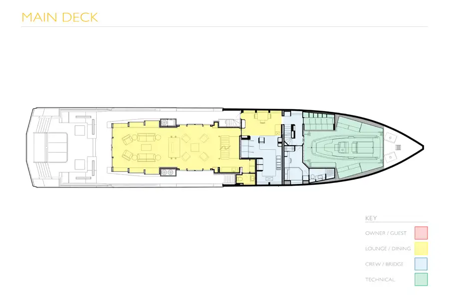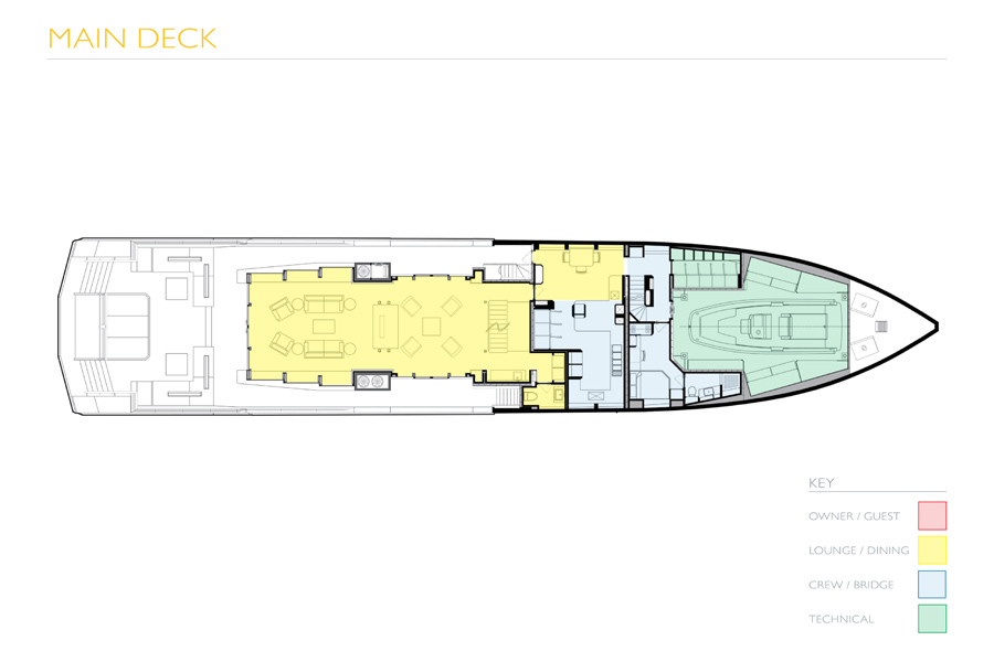 Wake up in your master cabin on the upper deck and look out at the anchorage. Commanding elevated views, your suite and private terrace gives you the seclusion to truly unwind. The cabin décor is simple and elegant, complemented by huge windows on three sides - creating the perfect atmosphere for relaxation. Your guests are just as comfortable on the lower deck in four further cabins. Meet them for breakfast in the main saloon, which shows off stunning modern interior design, lit by full-height windows that open onto the side decks.
