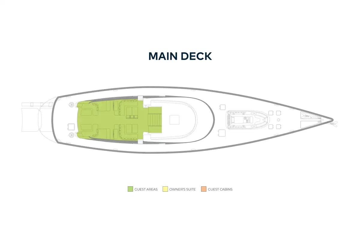 Ideal accommodation for six guests but possibility to accommodate 10 guests (with children). The full width master cabin can be divided into a smaller master cabin plus twin bunk cabin arrangement. The 'his and hers' en suite bathrooms in the master cabin in full cabin mode become an en suite for the master and an en suite for the bunk cabin when the partition is in place. The two double guest cabins can be converted to two twin cabins with pullmans.
