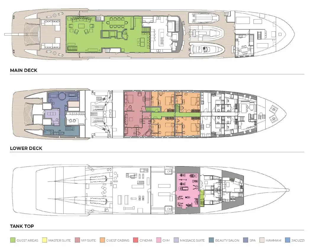 The key features of this amazing vessel include what is believed to be the largest and most comprehensively equipped spa/wellness centre on any private yacht available for charter, staffed by a professional beautician and masseuse. There’s also a large gym, a high-end movie theatre and an outdoor saloon large enough to seat up to 60 diners, which converts into a disco deck with a professional-spec DJ booth, sound system and dance floor. An elevator links the main deck with the sundeck and all other decks in between.