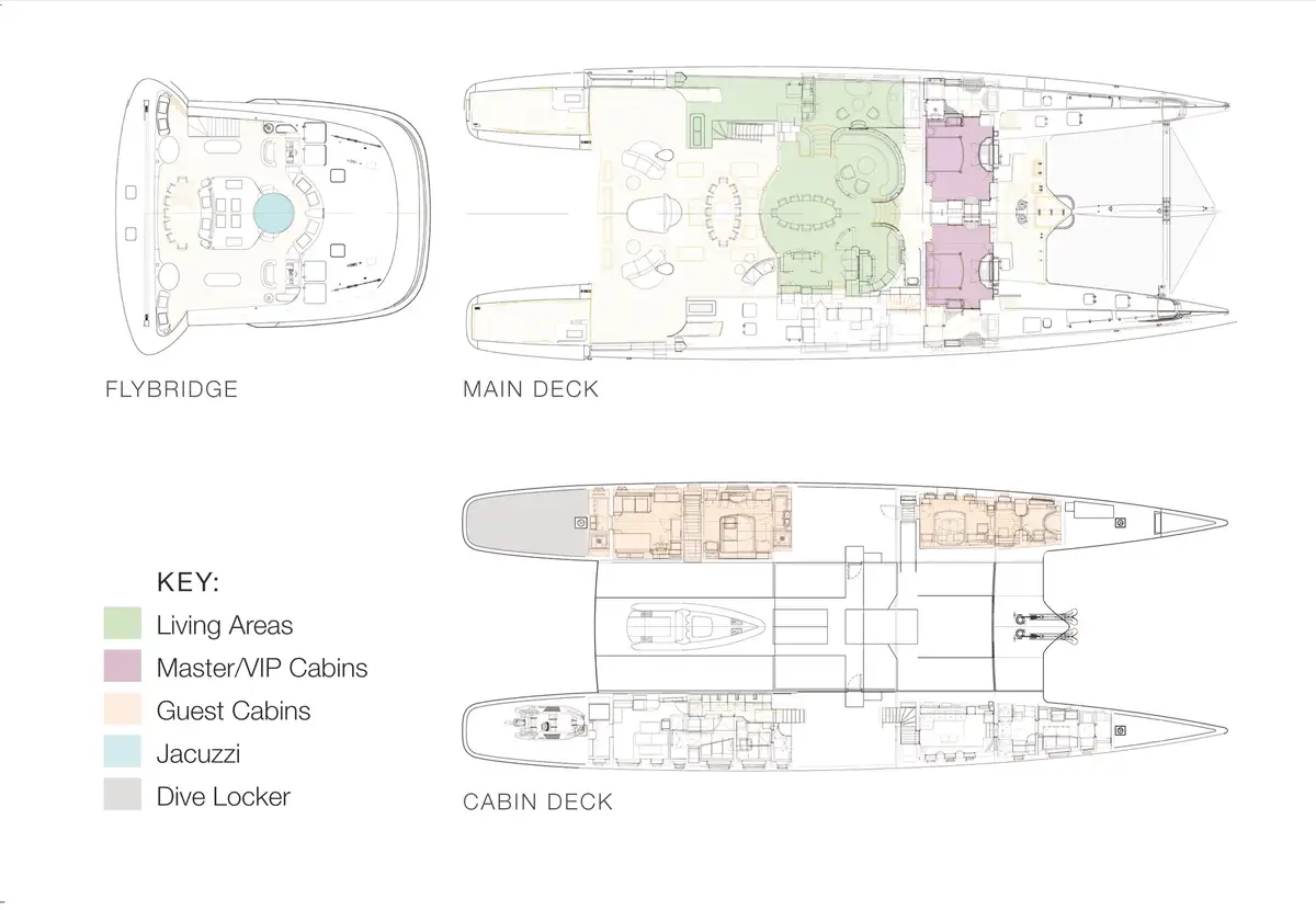 With a 16.6m (54.5ft) beam, her deck spaces are vast. From her flybridge jacuzzi and al fresco dining areas to her shaded spaces on the main deck aft and the sunbathing trampoline forward where you can watch dolphins play underway, she covers every base for relaxation and entertainment. Two VIP cabins on the main deck each have access to a terrace lounge forward and her award-winning interiors are refined yet instantly welcoming.