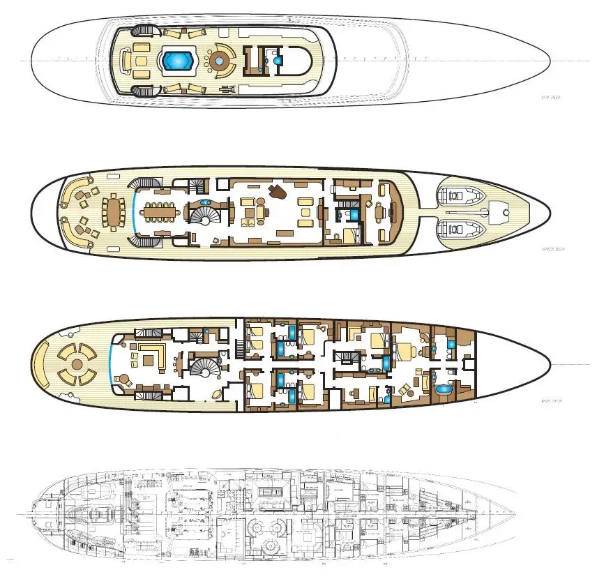 The sense of warmth and grandeur continues on the main deck, with a sophisticated bar, rich fabrics and intricate detailing in the main salon. All six of the guest cabins are located on this deck, providing luxurious accommodation for 12 guests. Relax in the impressive, full beam master suite, with its romantic window seat and huge lounge area. His and hers bathrooms, his and hers walk-in wardrobes and a separate study/library ensure there is infinite space and ultimate privacy at all times. The VIP suite also has its own seating area, desk and walk-in wardrobe, while a further three double cabins and a twin all have large windows and en suite bathrooms.