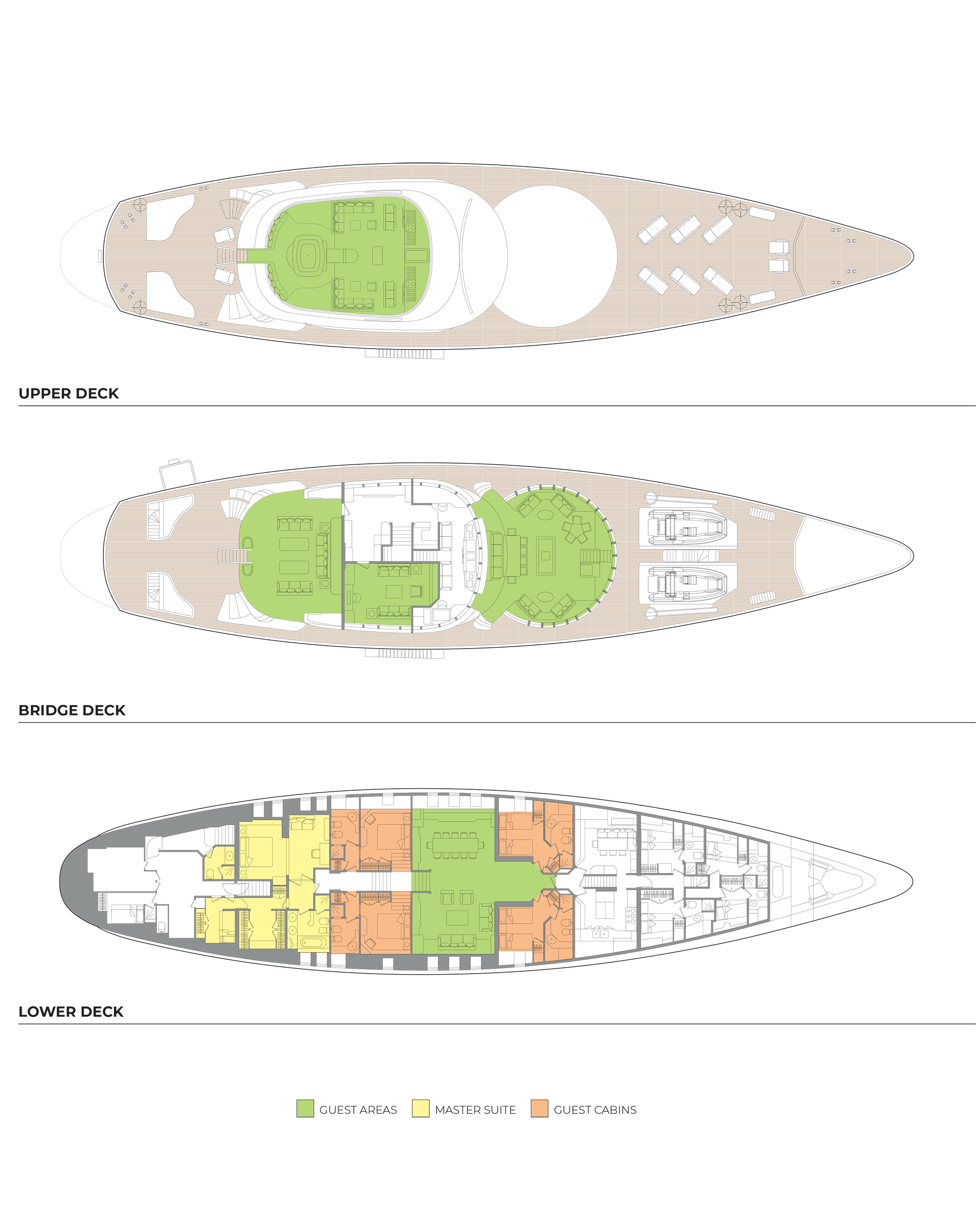 - Large options of outdoor guests spaces for dining, lunch and breakfast, lounging and shading on all decks with canopies on the forward deck and aft, and movable umbrellas