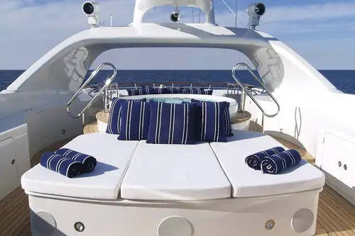 Offering vast deck spaces throughout, the main deck aft is the prime location for al fresco dining and socialising with no shortage of comfortable seating. The sky lounge area can be converted to an additional double cabin with a pull-down murphy bed when required. This flexible area completely opens up to the exterior deck on this level - an ideal party location! The sun deck above is the best relaxation area with surrounding sun pads and a centrally located jacuzzi. The yacht’s social areas extend to the interior main deck lounge where an open seating area with 65inch TV leads through to a more formal dining area. There is plenty of space to seat 12.