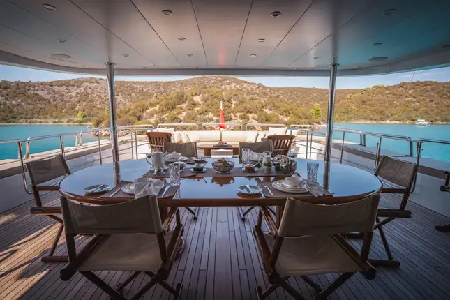 LADY G II shows in mint condition following a completed and thorough refit in 2019. A beautiful woodwork interior exhibits Italian craftsmanship at its finest. On main deck aft guests will find a comfortable sofa seating with chairs which is perfectly located for a quiet coffee or glance at the surroundings. Entering the interior part of LADY G II the main lounge is tastefully decorated in rich cream and neutral colours with both sofa corner and arm chairs followed by a spacious main dining area which easily accommodates 10 guests.
