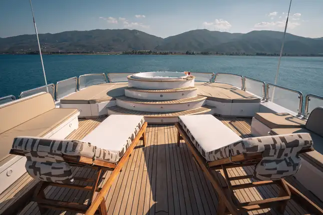 The sky lounge is dressed in white fabrics with sophisticated art deco details and has a bar leading to the deck area. Here you find comfortable and shaded dining for 10 guests as well as a sofa area offering total privacy. Her large sun deck is perfect for total relaxation with a bar, dining area with manual electric bimini for shade and large jacuzzi area with surrounding sun pads with amazing views.