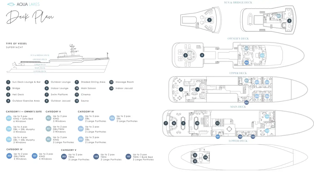 | Cabin types | 11 (8 × double, 2 × double/twin, 1 × twin) |