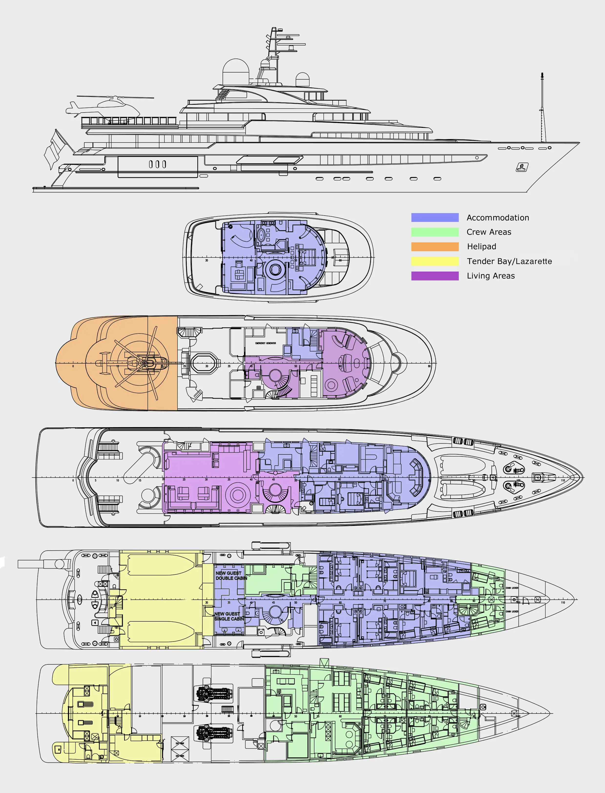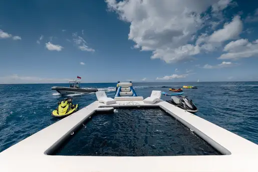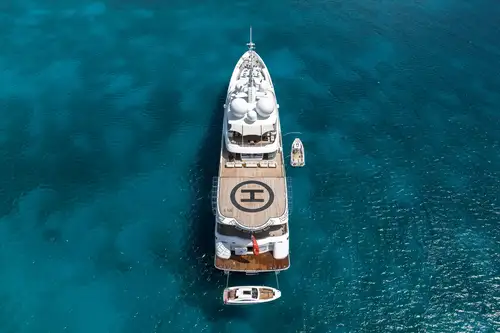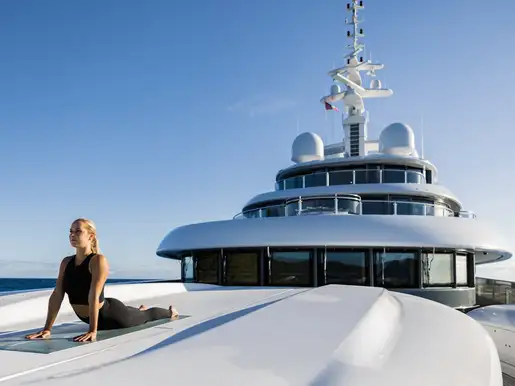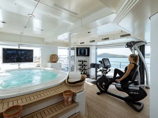 Spend the day gazing at the pristine surroundings from the helipad convertible into an extensive sun lounging area with stylish loose furniture. It is also fully certified to land a helicopter on charter. If you wish to get some exercise, the adjacent gym has all the latest equipment and a large central jacuzzi.