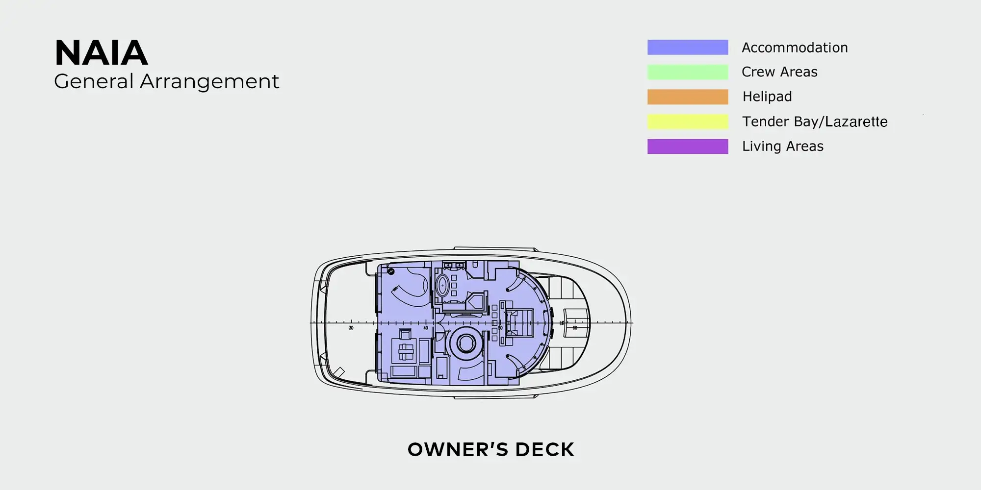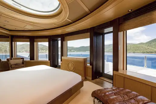 NAIA has a dedicated owner's penthouse deck hosting the master suite with panoramic views, office, private exterior terraces forward and aft, and a stunning bathroom featuring elements of bamboo and light stone. A further six double guests cabins, four of which convert to twins, plus a single cabin with additional pullman berth are all on the main deck benefiting from plenty of natural light and outstanding views. An elevator serves all decks.