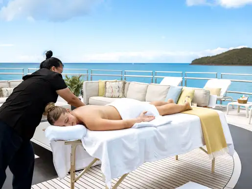 Everything in the luxurious yet soothingly zen interior by Mark Berryman has been carefully designed to create a warm and welcoming environment. Guests will be wowed by the gorgeous bridge deck lounge, featuring rich leather flooring perfectly combined with mild brown wood panels and cabinetry. Large U-shaped sofas, a cinema screen and a dining table are an invitation to relax and socialise with family and friends.