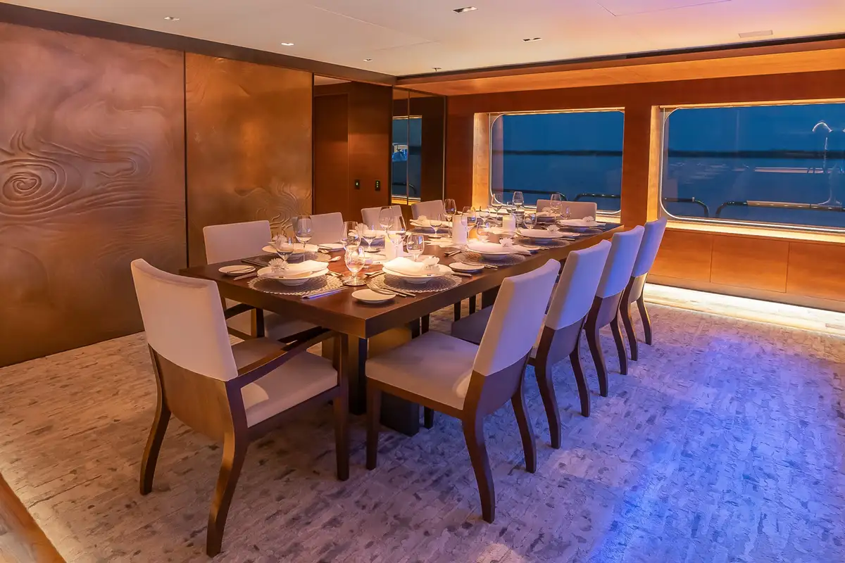 Her elegant main lounge and formal dining are divided by an aquarium panel, with cosy seating around coffee tables at the centre, with walkways either side for access to the dining area with seating for up to 12 guests. The sky lounge is less formal and has a huge L-shaped sofa opposite an L-shaped bar. Up to 12 guests are accommodated in a full beam master suite with separate office, a VIP cabin, three double cabins and one convertible double/ single cabin with an additional pullman berth.