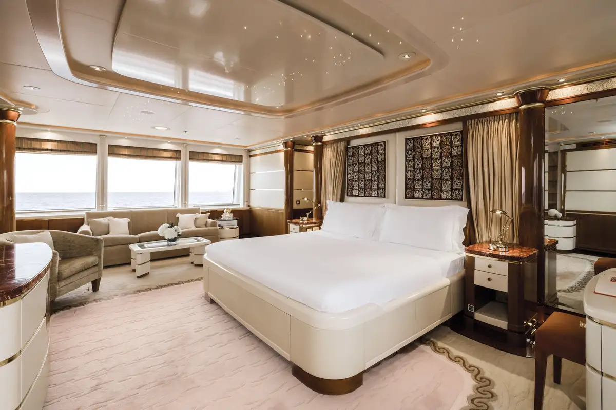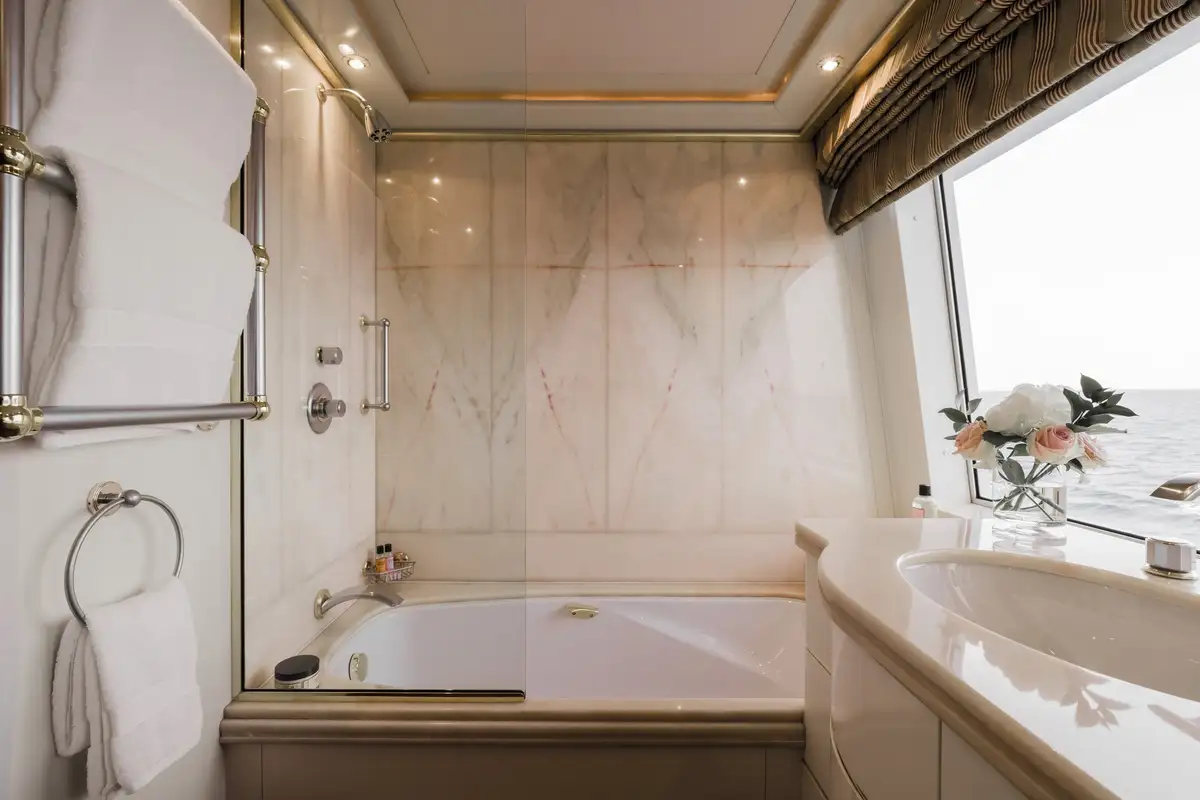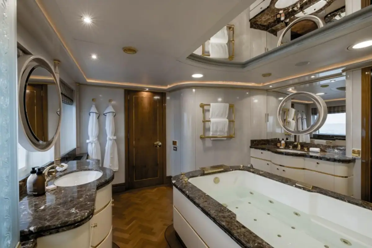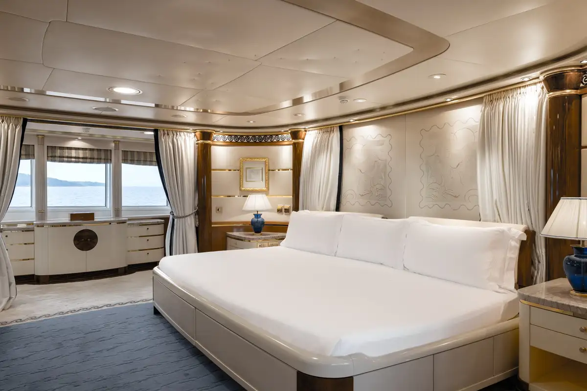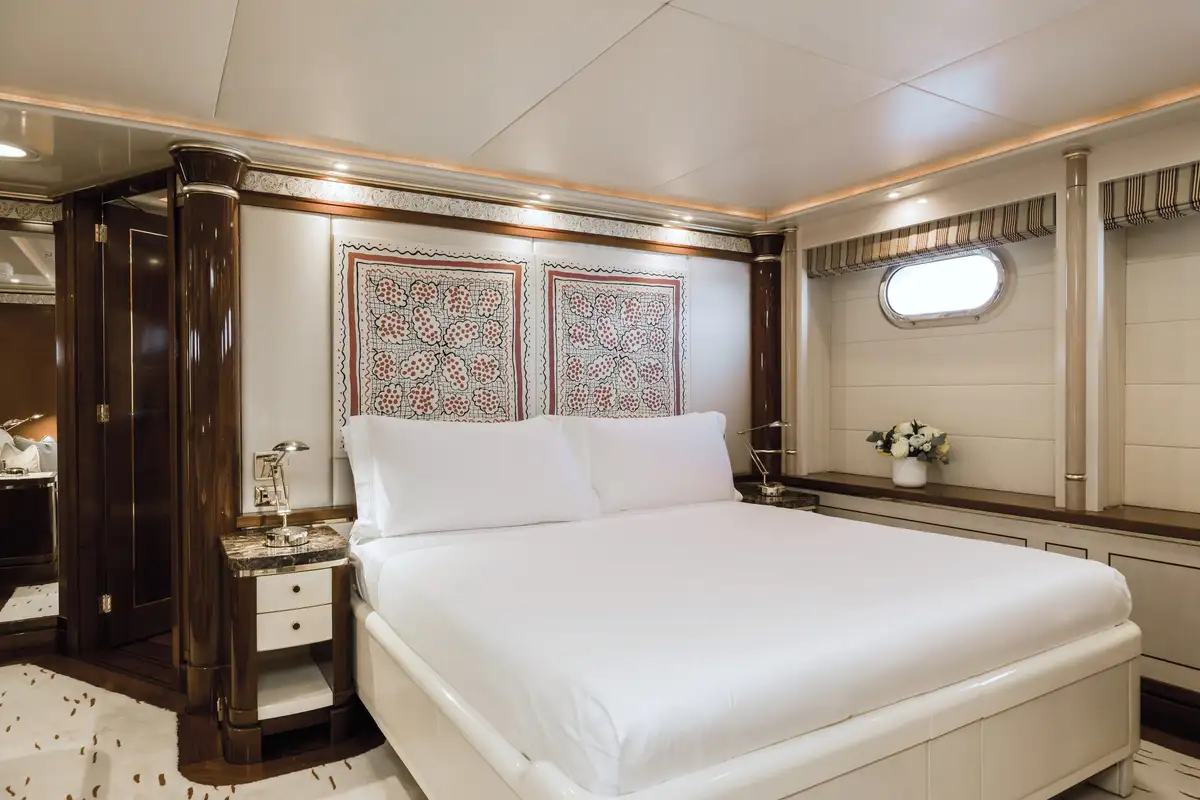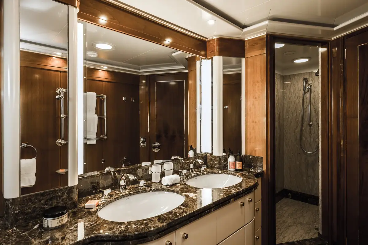Where this yacht differs from almost all others, is in the versatility of its accommodation. She is very well suited to parties with two principals because she has two full-beam, master-standard suites. On the main deck is the full beam master with a ‘US Caesar’ bed and a vast en suite bathroom, walk-in closet and its own private 180-degree observation salon where you can enjoy your morning coffee as you look forward to the day ahead or watch one of the two televisions in the relaxing environment.