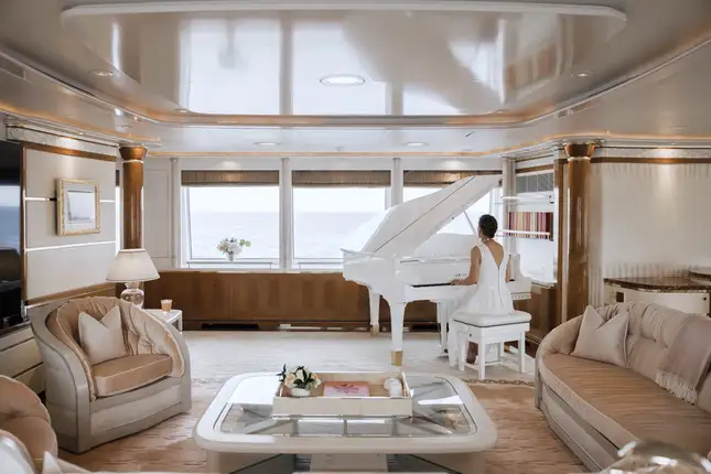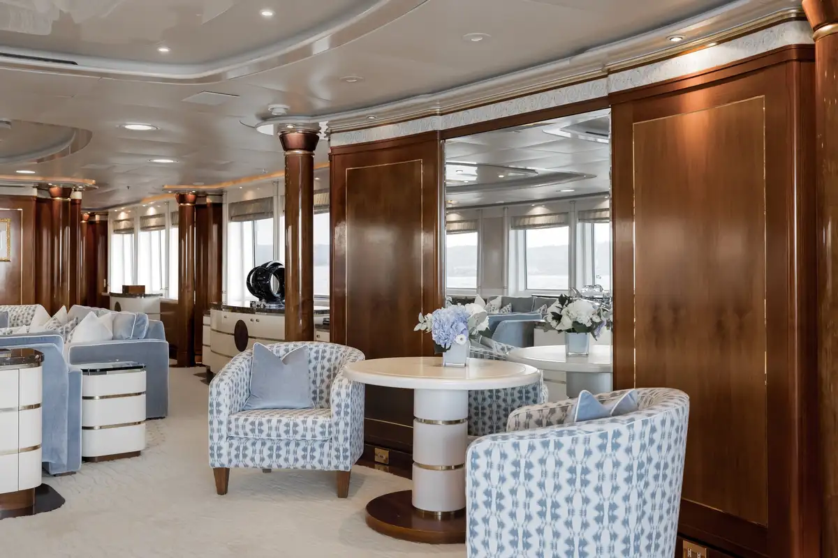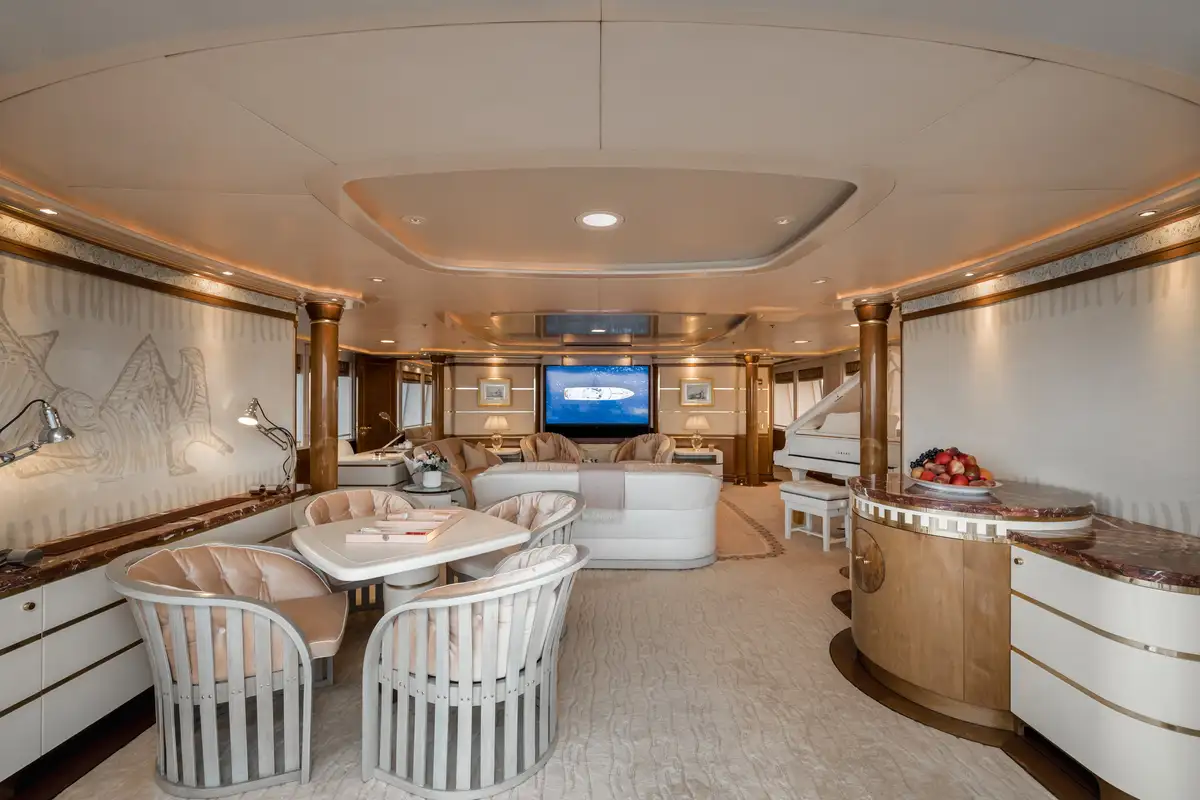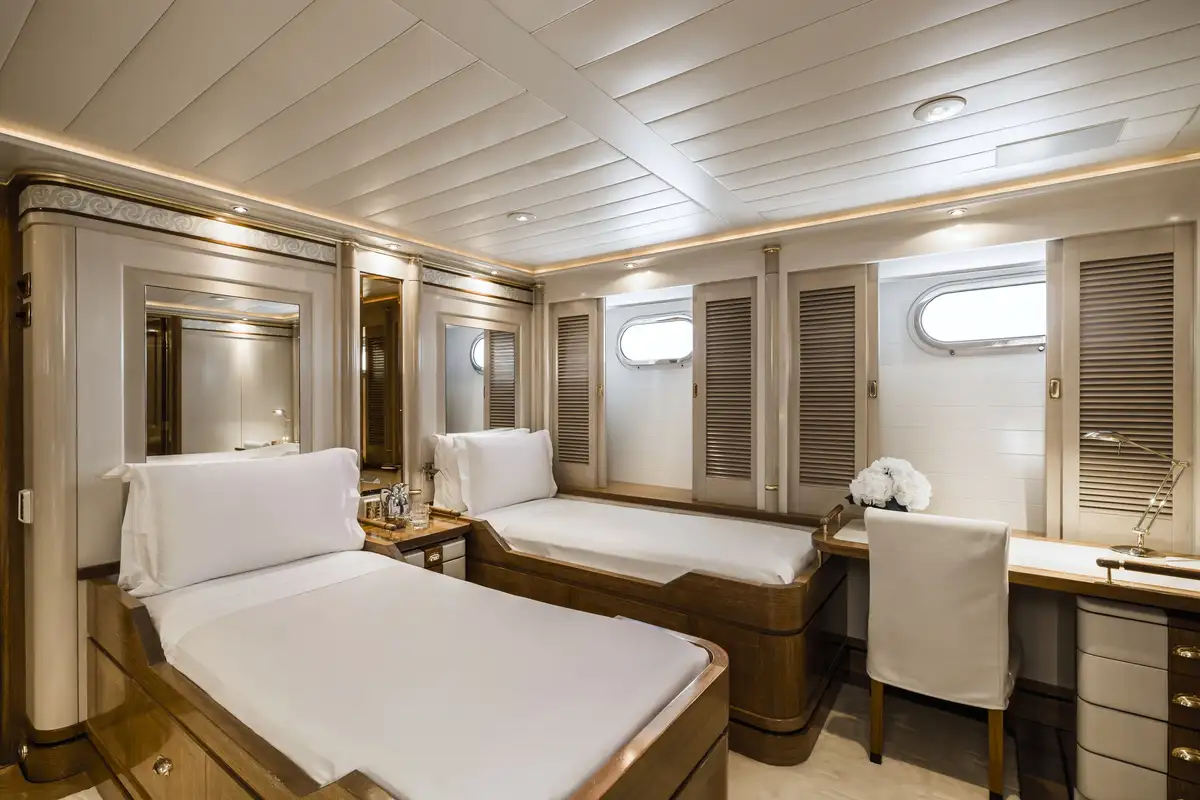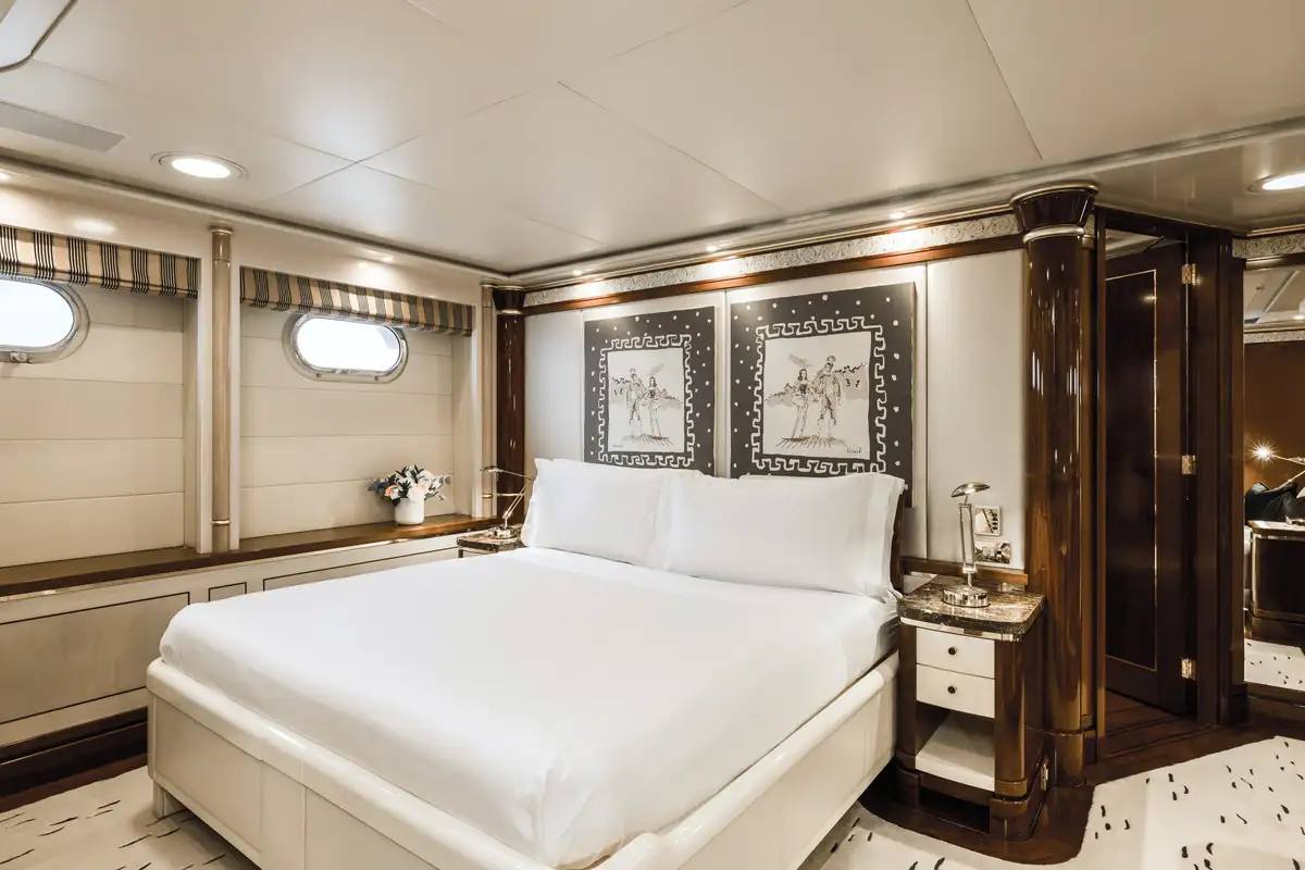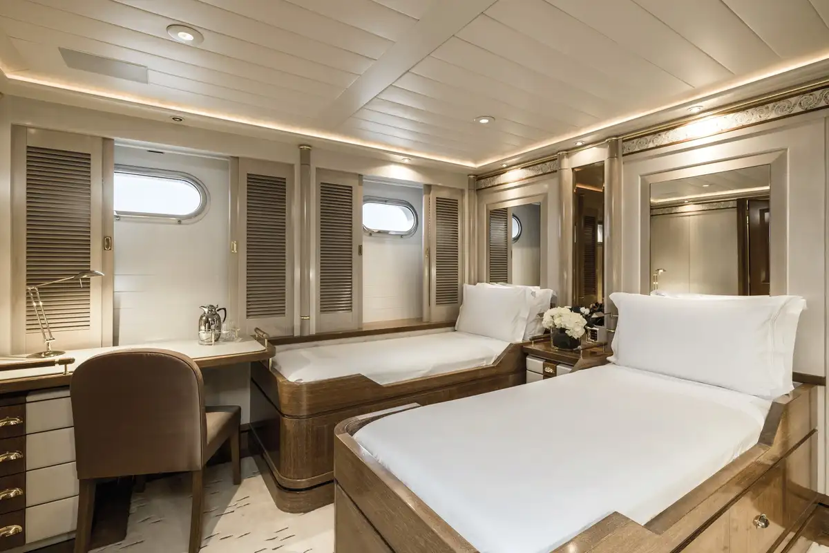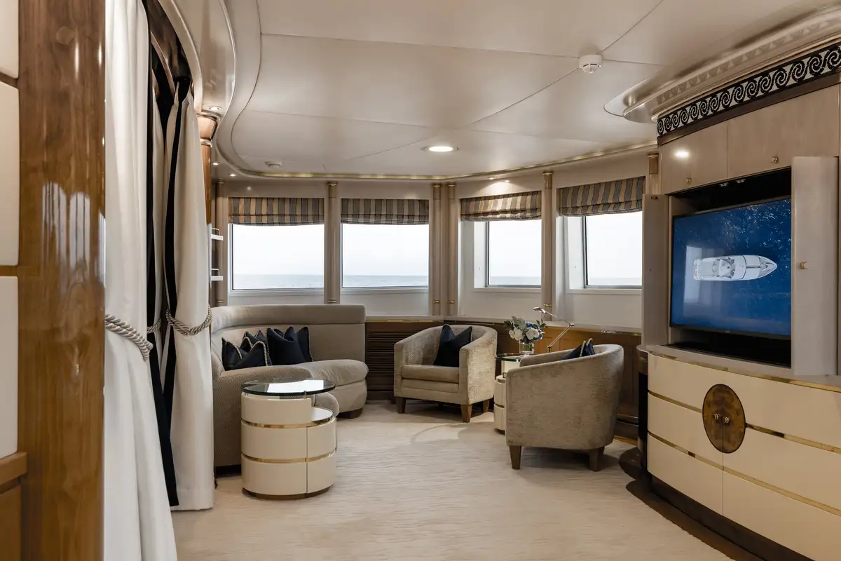 Where this yacht differs from almost all others, is in the versatility of its accommodation. She is very well suited to parties with two principals because she has two full-beam, master-standard suites. On the main deck is the full beam master with a ‘US Caesar’ bed and a vast en suite bathroom, walk-in closet and its own private 180-degree observation salon where you can enjoy your morning coffee as you look forward to the day ahead or watch one of the two televisions in the relaxing environment.