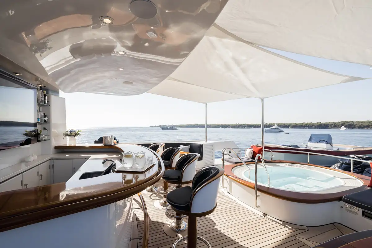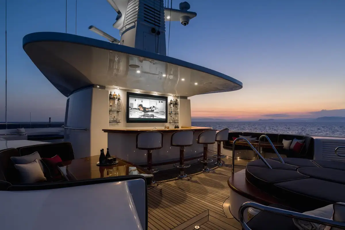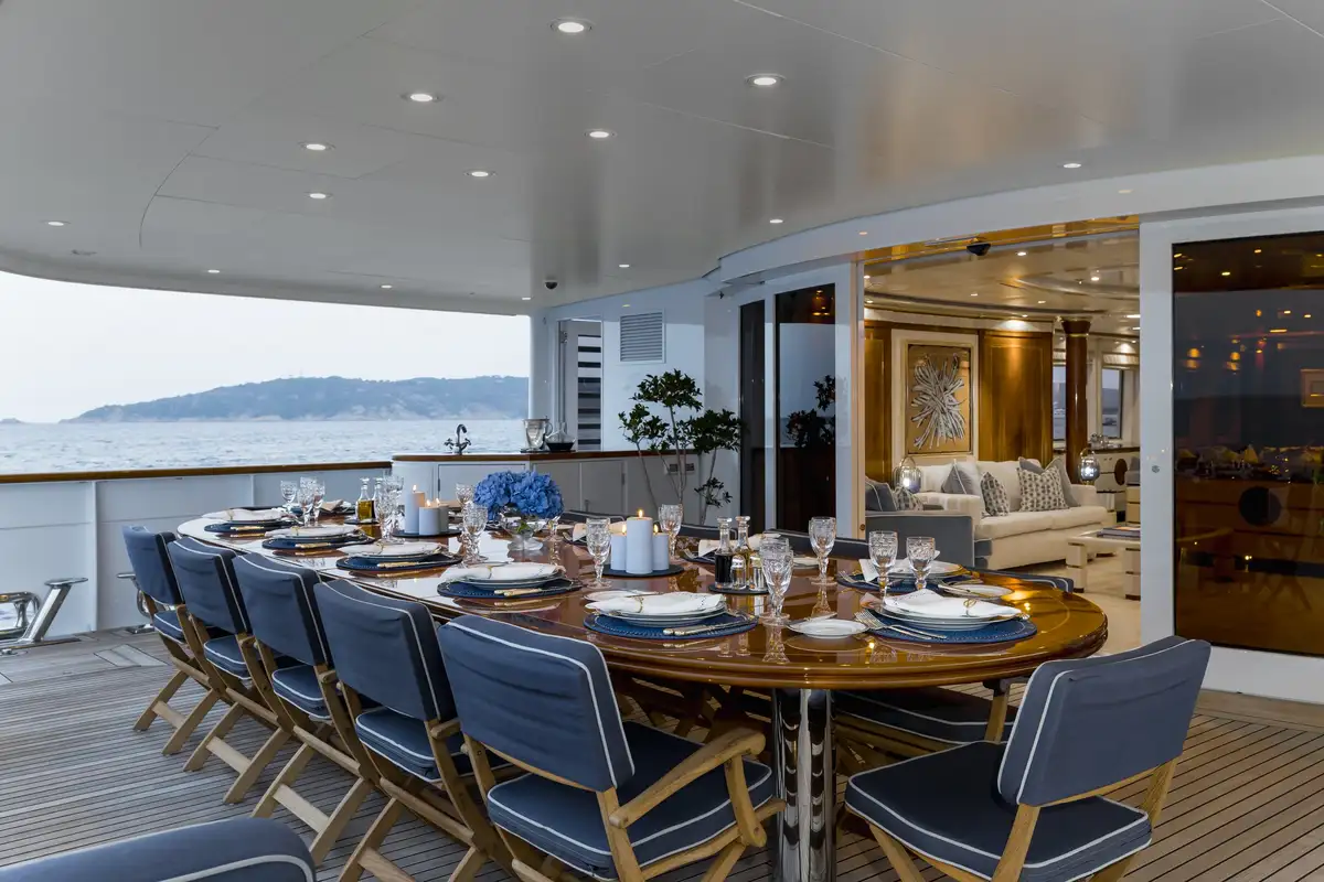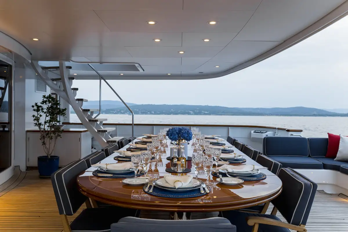 On the bridge deck is a full-beam VIP suite with wonderful views through picture windows from its elevated position, piano and desk area. Should you wish, this can be more of an owner’s deck set-up as it can have its own spacious lounge and terrace aft. The terrace provides table dining for 10 with a spacious lounging area.