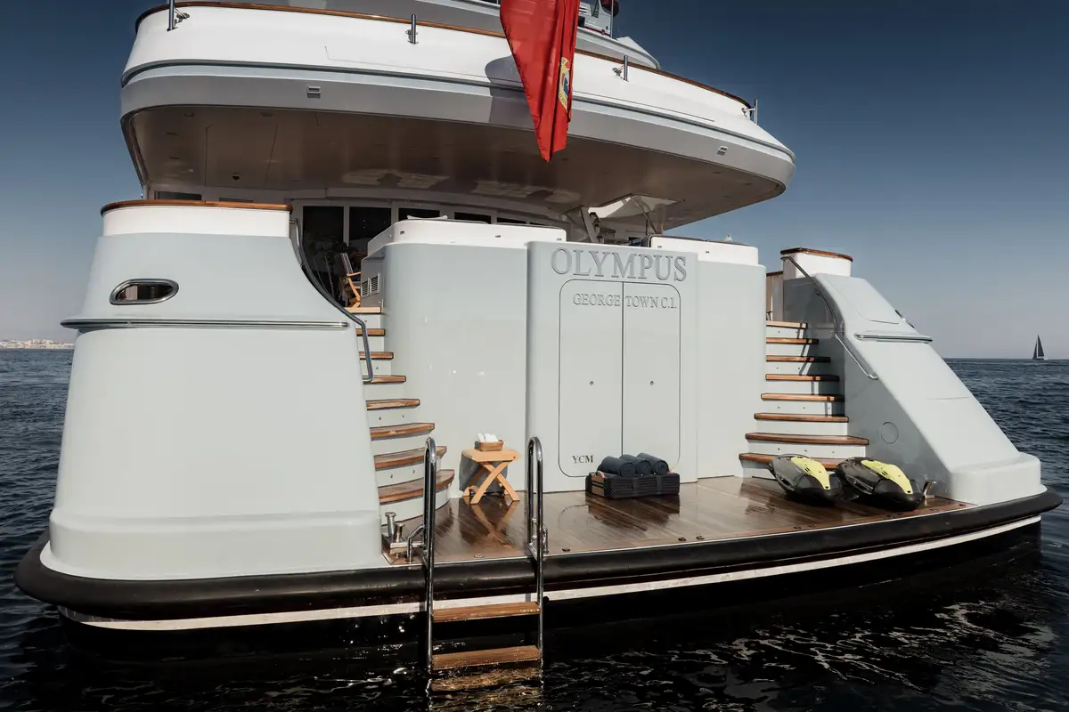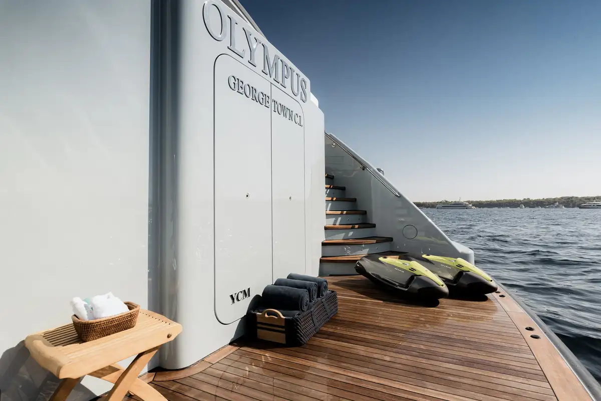 Olympus is spoilt for tenders with a 12m (42ft) Mil-spec Safe Boat chase tender with 3x 300hp Yamaha outboard engines in addition to the two tenders on deck; an original classic 7 meter guests tender built by Feadship and a 7 meter jet drive Multi tender for watersports, diving and support work. In additional two wave runners jetskis and two seabobs for exploring below the water. She also has a locker full of snorkeling equipment and a dive instructor with five sets of dive gear allowing the ability to learn to dive or take a dive guide and to explore the oceans.