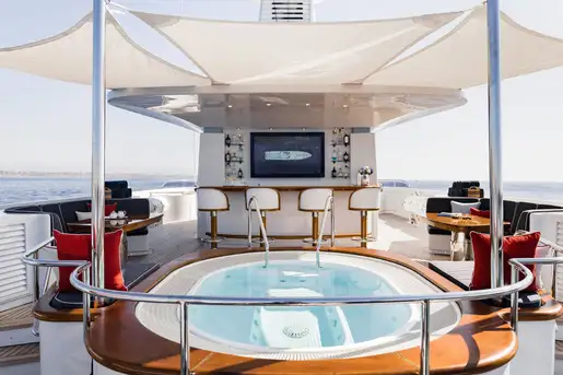She has a great many crowd-pleasing features, with six beautiful state rooms and two additional staff cabins. The sun deck jacuzzi and sit-up wet bar for refreshment by day, by night the jacuzzi can be covered and turns into a lounger for movie nights on the TV screen behind the bar. There is a day head on every deck, elevator serving all four guest decks, making her very well suited to multigenerational groups.