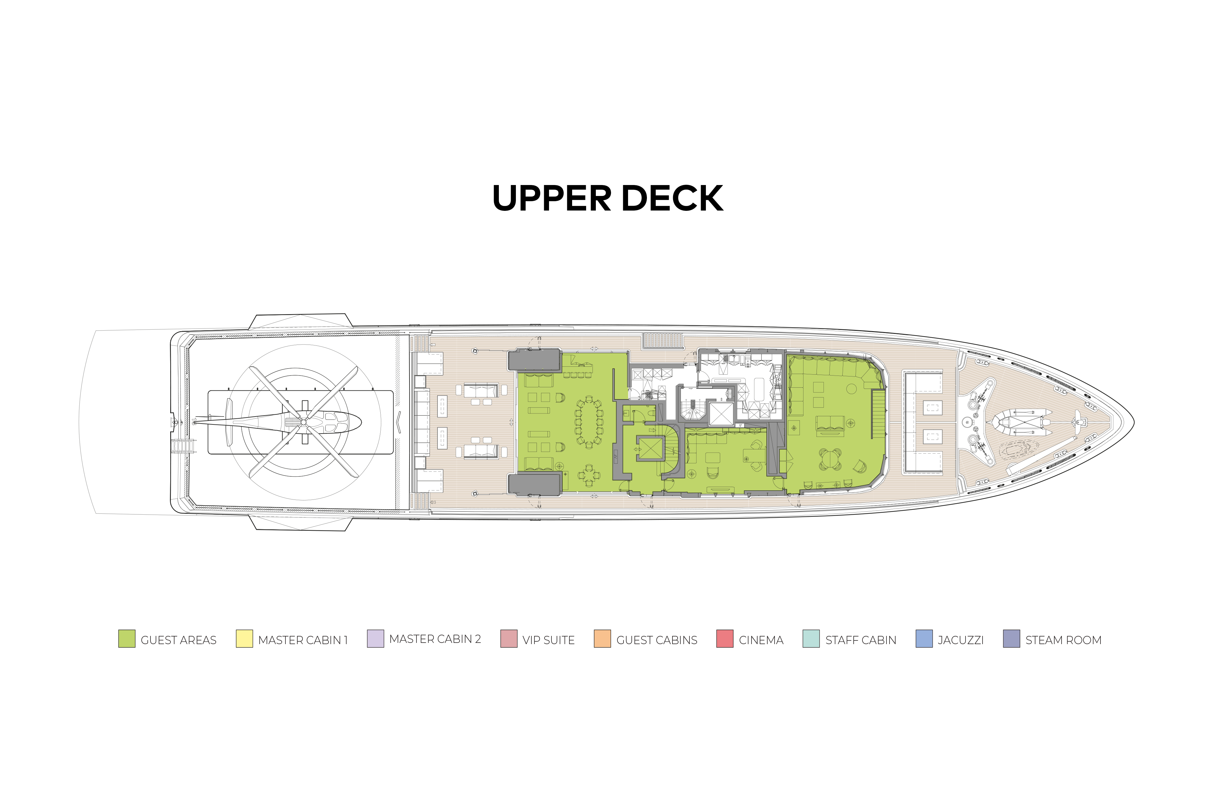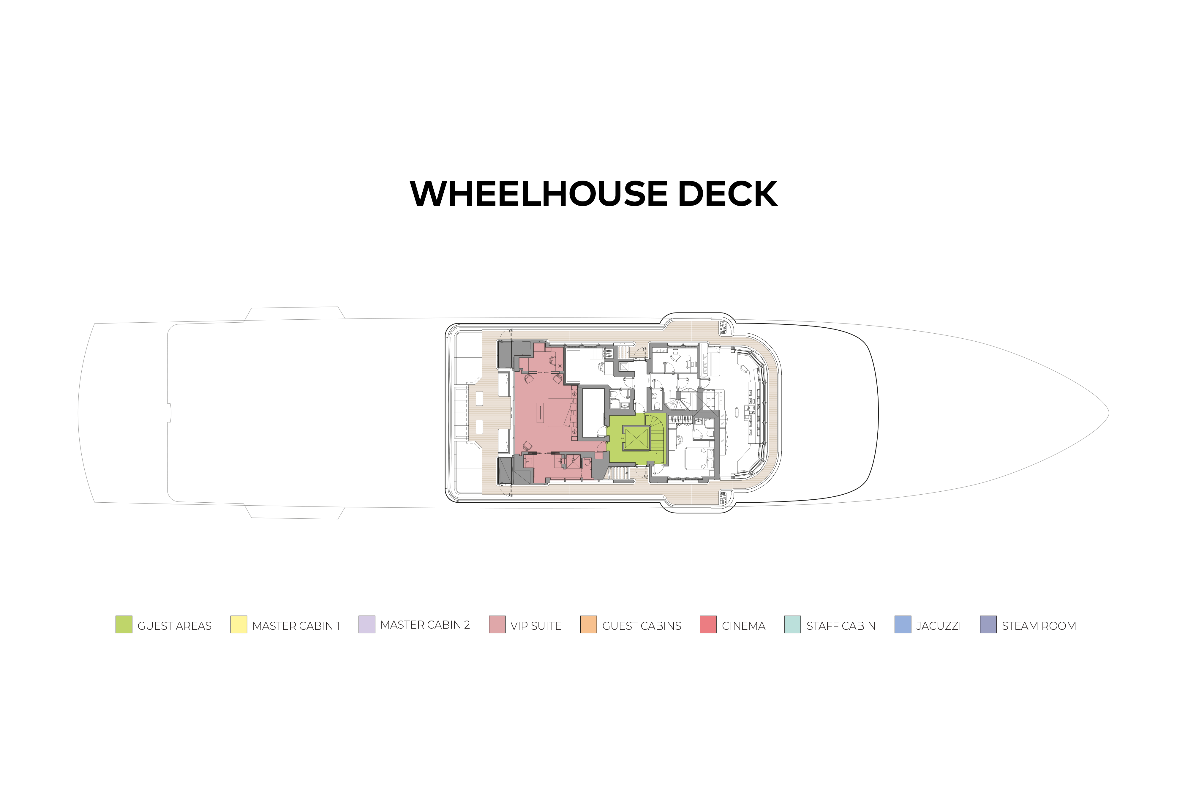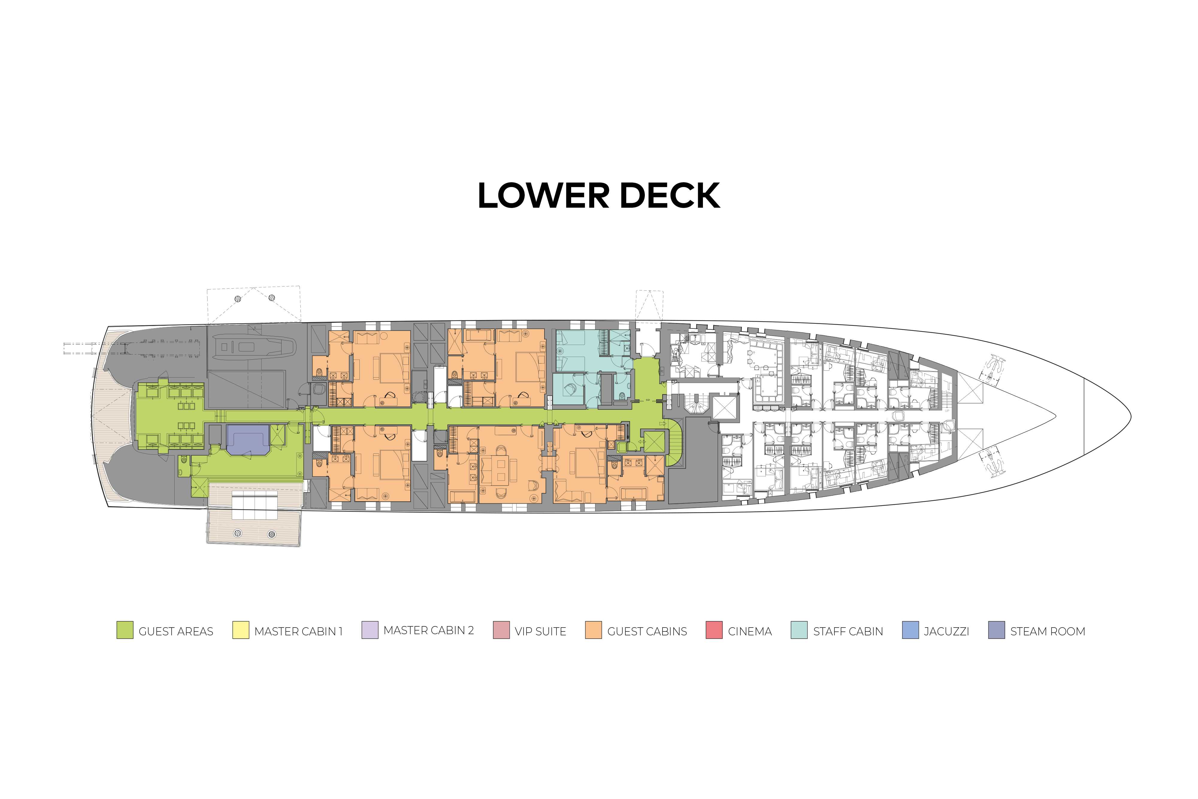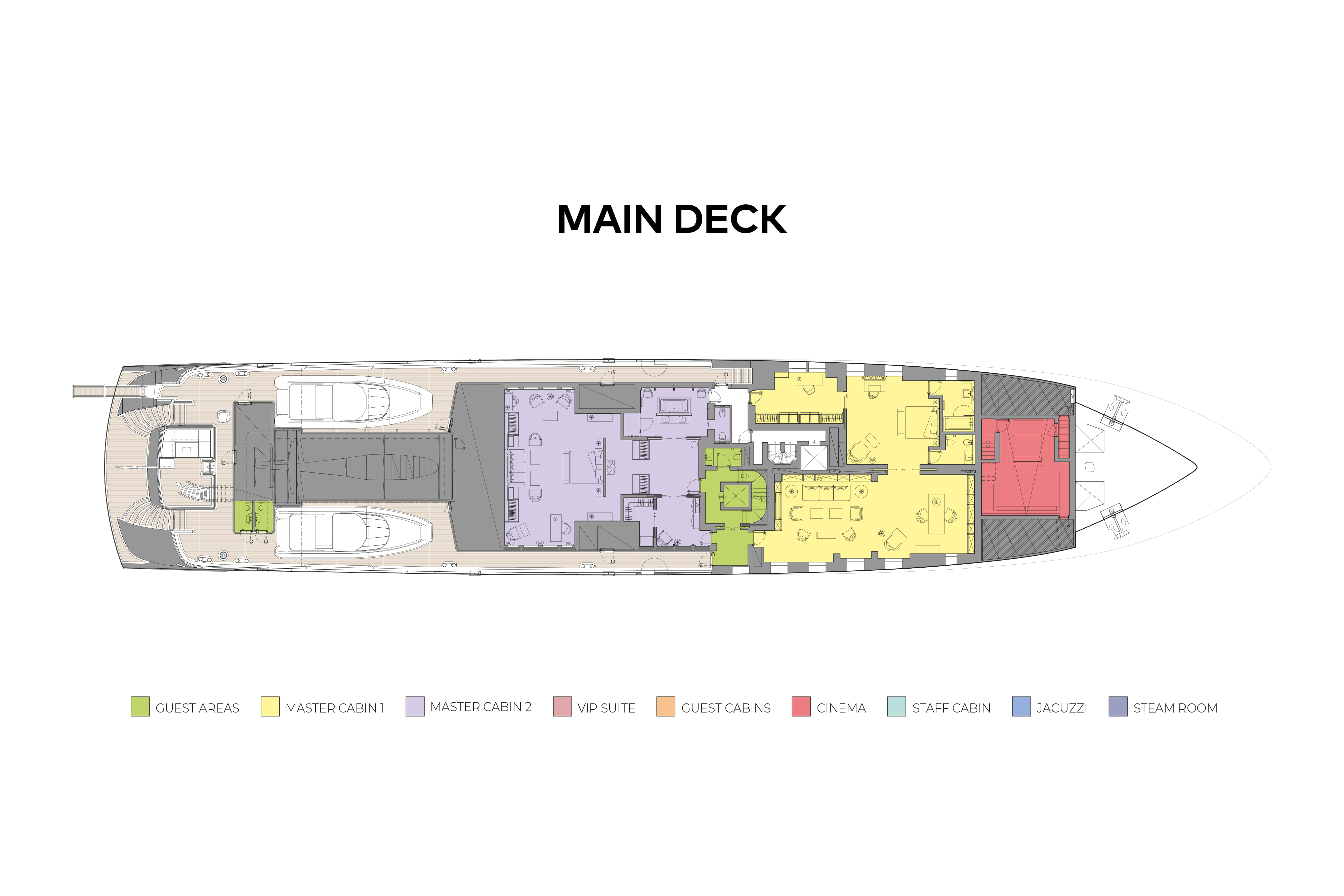 - Three VIP cabins, including one convertible to two double guest cabins (one with double sofa bed)