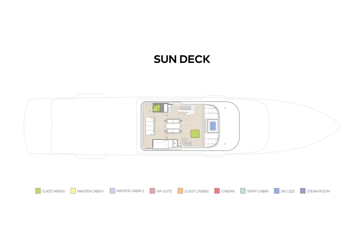 The guest deck enjoys its own entrance and lobby at the stern of the yacht. As you walk to one of five double suites, you will pass the steam room and beach club with its spectacular sea terrace.