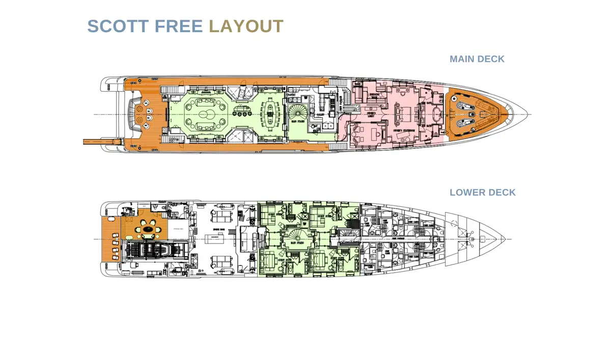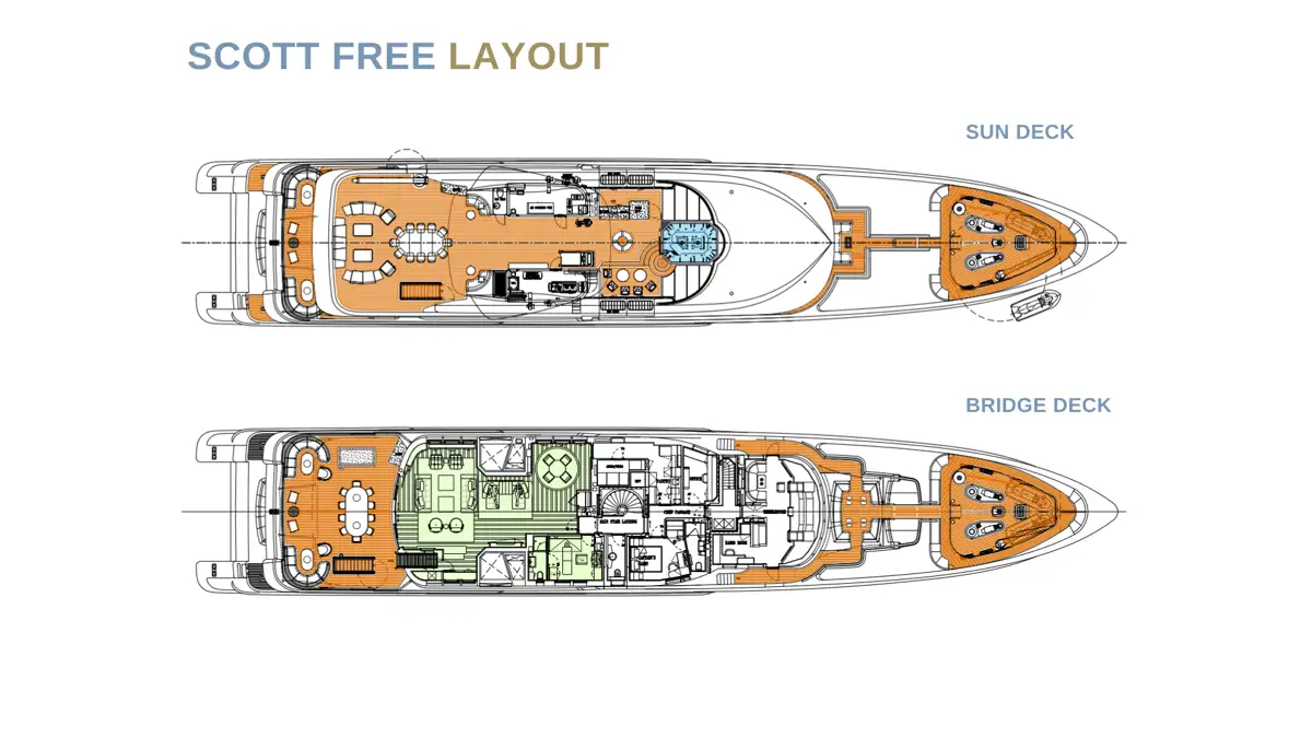 Having completed a circumnavigation of the world under her first ownership, SCOTT FREE is now a proven and highly regarded charter yacht and has been maintained to the very highest standards. She offers a highly flexible accommodation layout with master suite on the main deck, and four guest cabins on the lower deck (two king size beds, two queen beds which can also be set up as twins), and one multipurpose cabin on the bridge deck with two pullman berths. The four lower deck guest cabins are also interlinked so can be set up as two full beam VIP suites complete with lounge area.