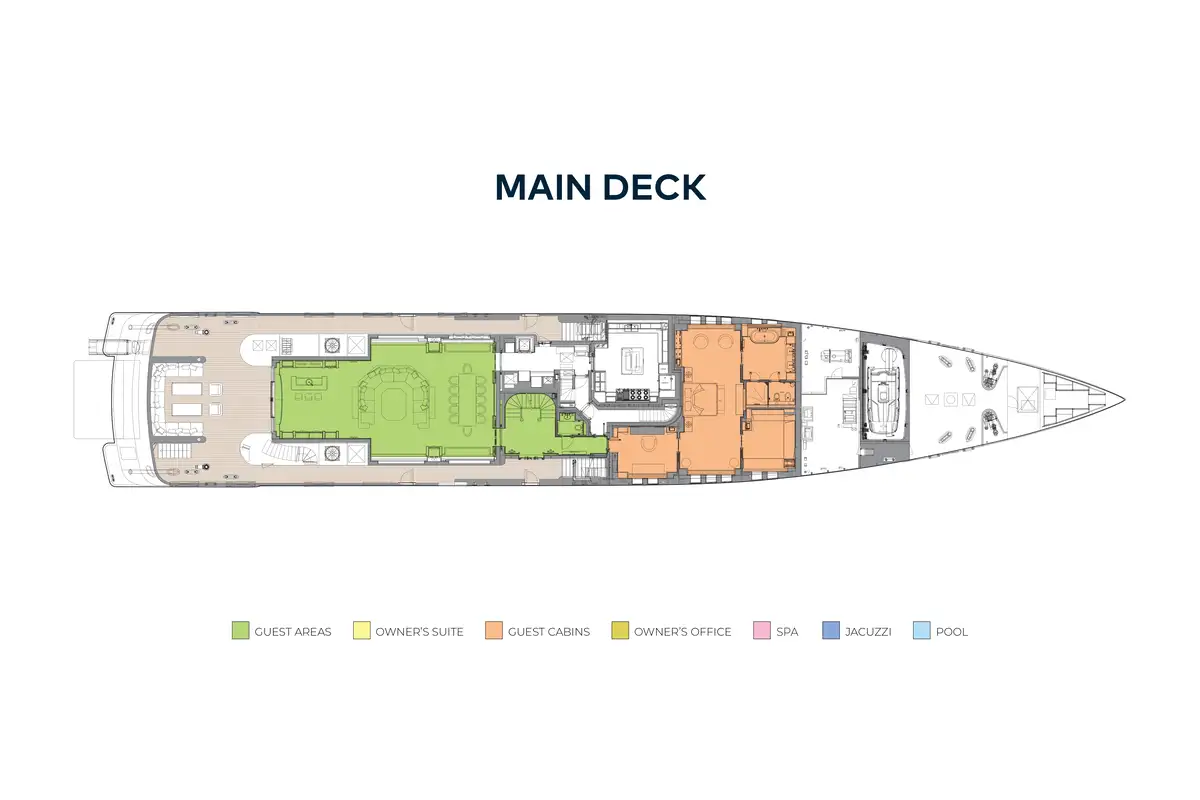 The exteriors are extremely well designed, offering a variety of areas to enjoy throughout the day: a split-level sundeck with large jacuzzi pool, bar, seating and sunbathing, dining on the upper deck aft and a very welcoming exterior lounge on the main deck aft.