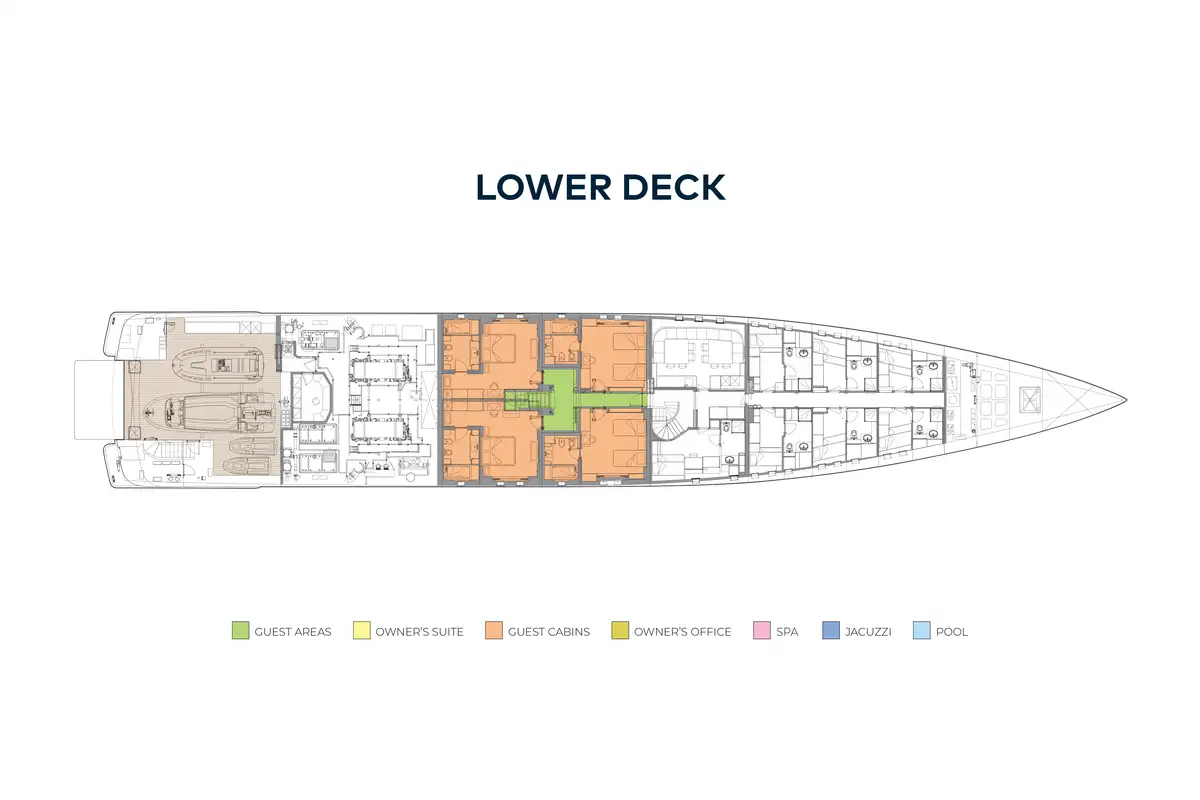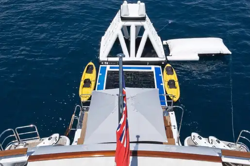 She offers flexible accommodation that is ideal for family groups. The full-beam VIP suite sits on the main deck and is as large as the master, with its own, separate lounge and spacious bathroom. The master is on the upper deck and comes complete with its own private deck and 180 degree views, jet pool and sunbathing area. There is also a nursery room with a cot adjacent to the master. The four other guest cabins are on the lower deck and are all doubles, though two can convert to twins if preferred.