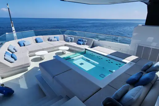 The sides of the aft deck fold down to open up the views completely and create even more versatile space for entertainment, relaxation and games like basketball, table tennis or a golf driving range with fish-food balls.