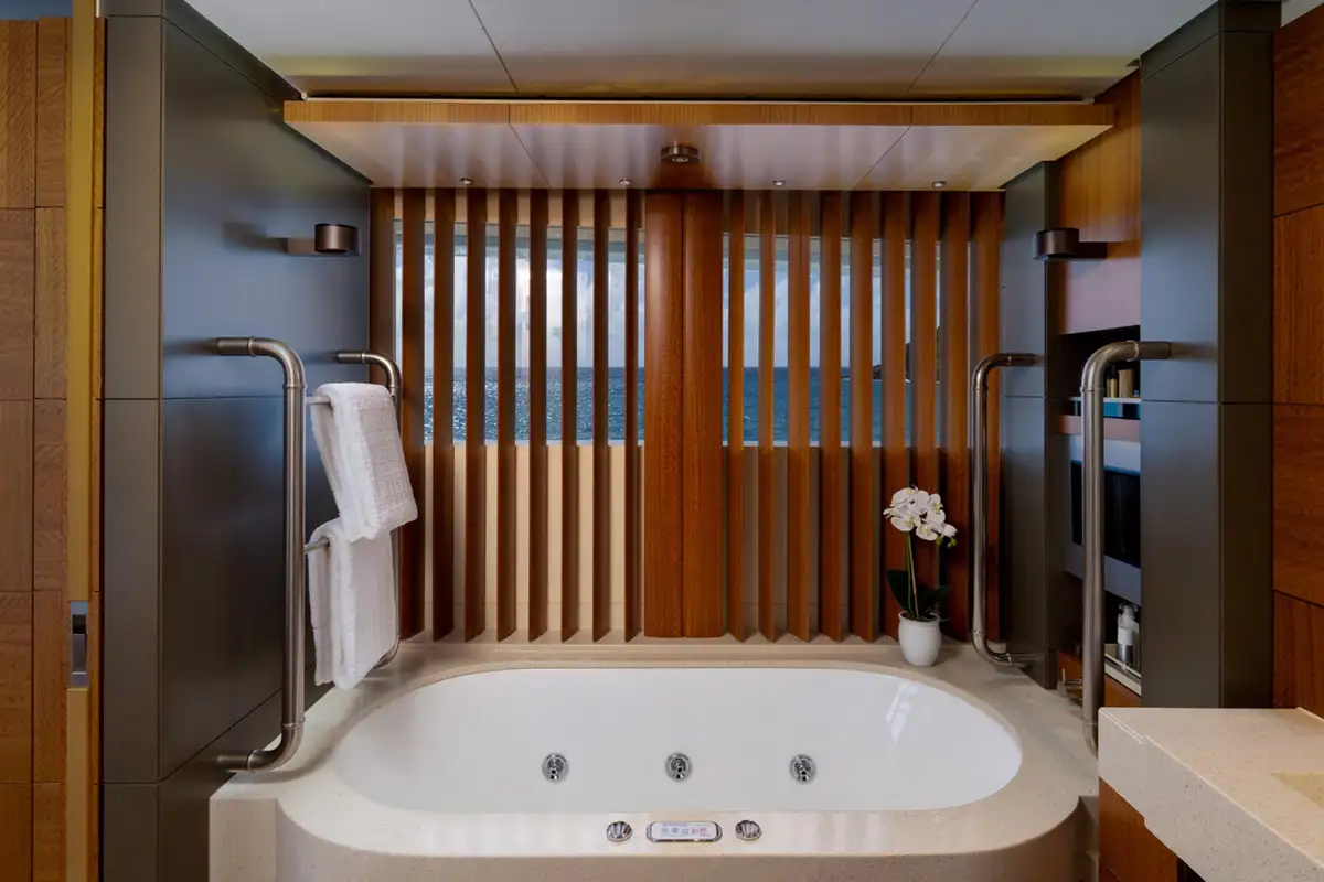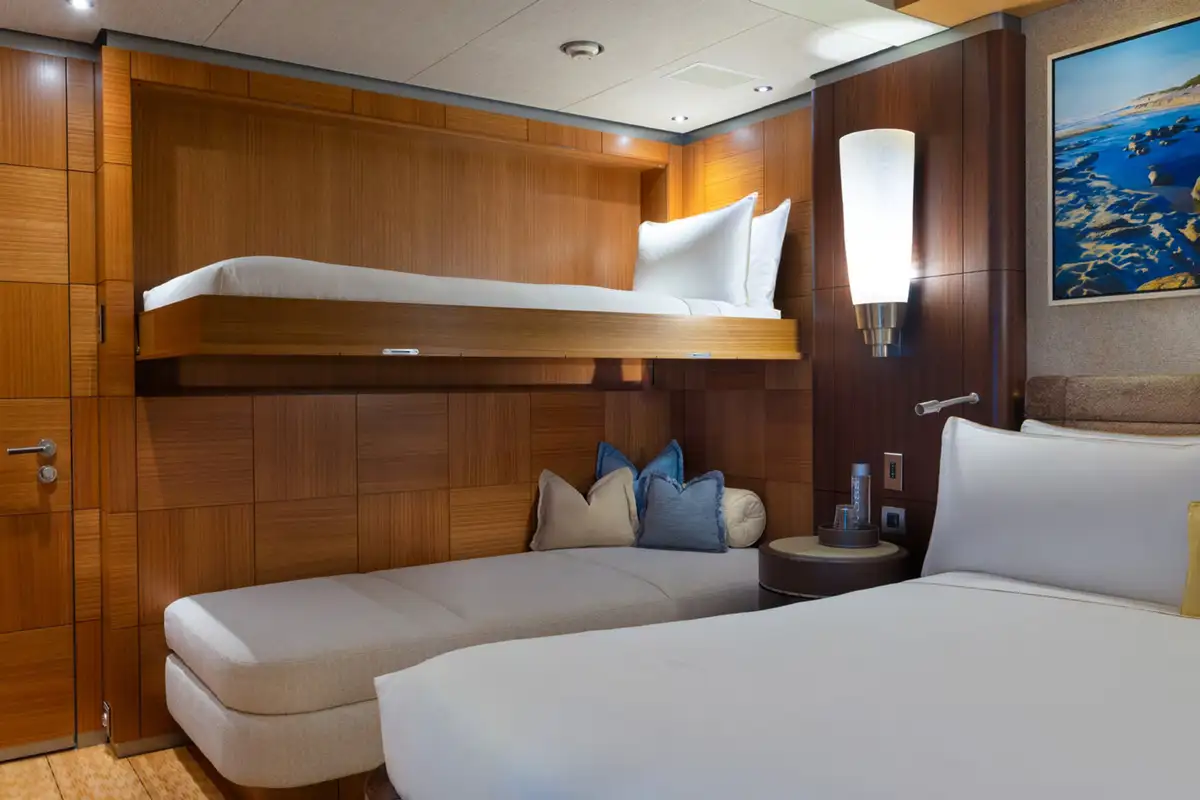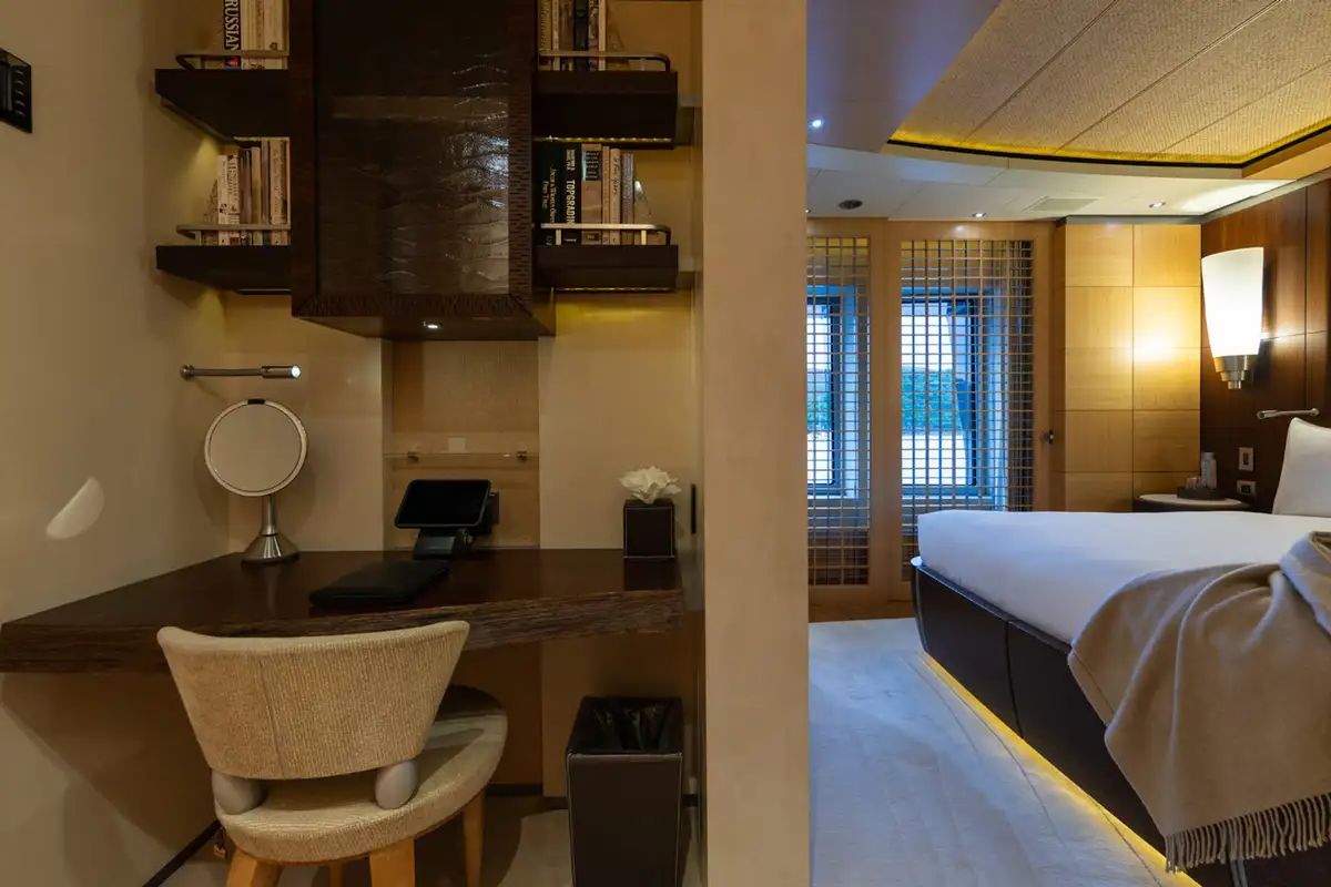 Large picture windows in the bridge deck and main deck allow natural light to flood in. The sky lounge has convivial seating around a coffee table for quality family time and in the evening guests can try their luck on a green baize games table forward. The main saloon has seating either side of a central hardwood floor that becomes the dancefloor in nightclub mode.
