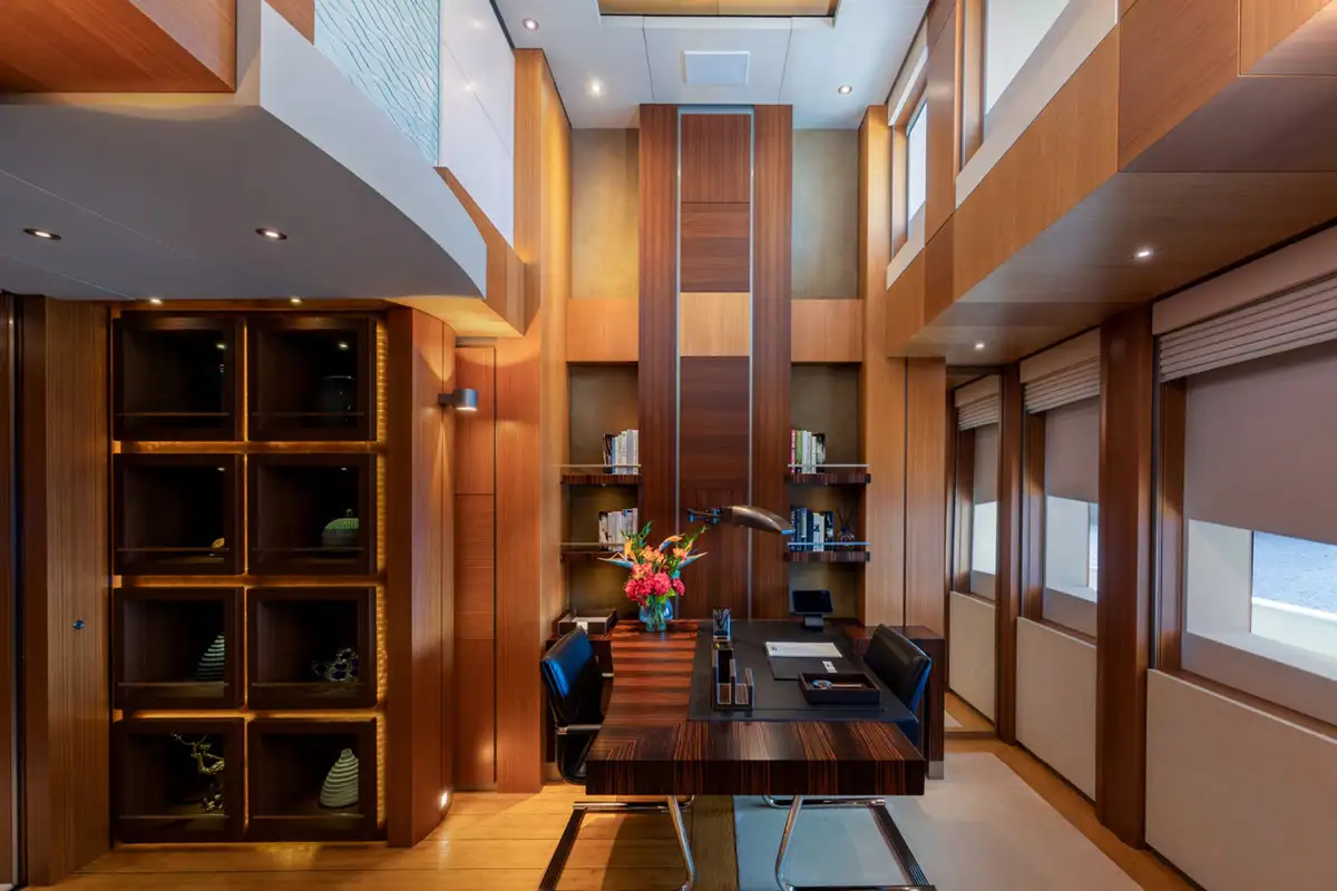 Other highlights include a split level master suite on the upper deck with panoramic views from the bedroom and a spectacular double height office bathed in natural light, a main saloon, complete with feature aquarium, that converts into a nightclub and an eight seat cinema on the lower deck, which is also home to two 9.5m custom Vikal tenders and a formidable fleet of watertoys.