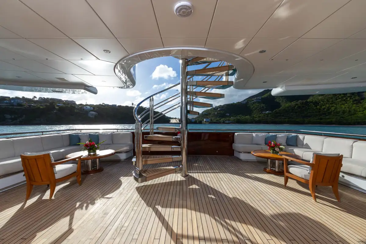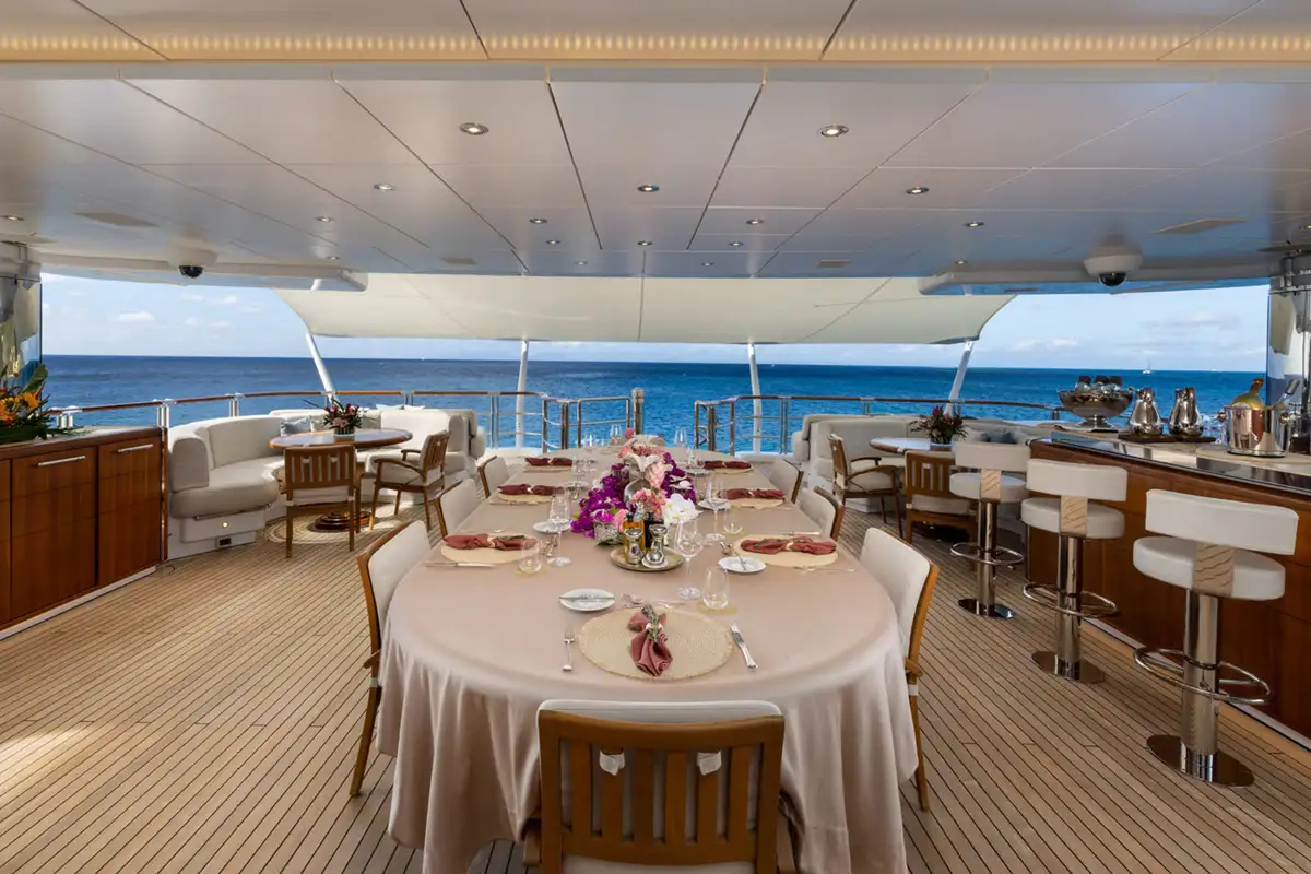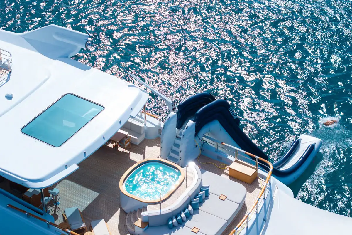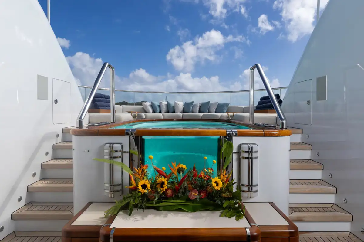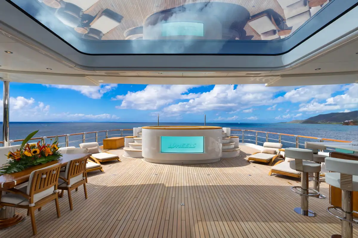 WHEELS is an absolute show stopper of a yacht. With 360 views from the crow's nest's day bed and bar stools, you can see the sun deck pool forward and the jacuzzi aft, both flanked by sunpads. Between them is a huge expanse of versatile deck space for yoga, open air massage, sun lounging, al fresco dining or entertainment and a fully equipped climate controlled gym for morning workouts.