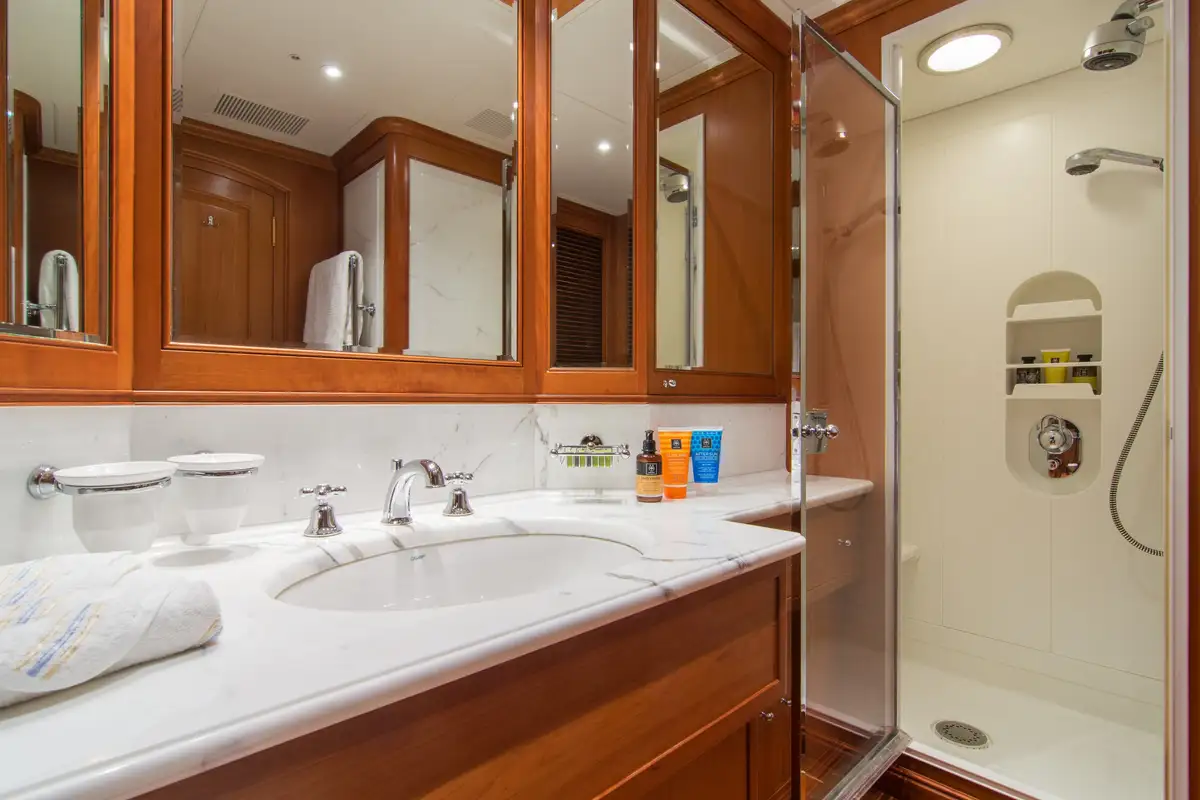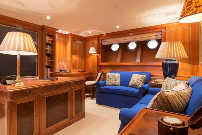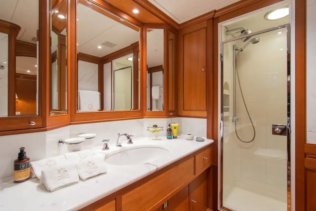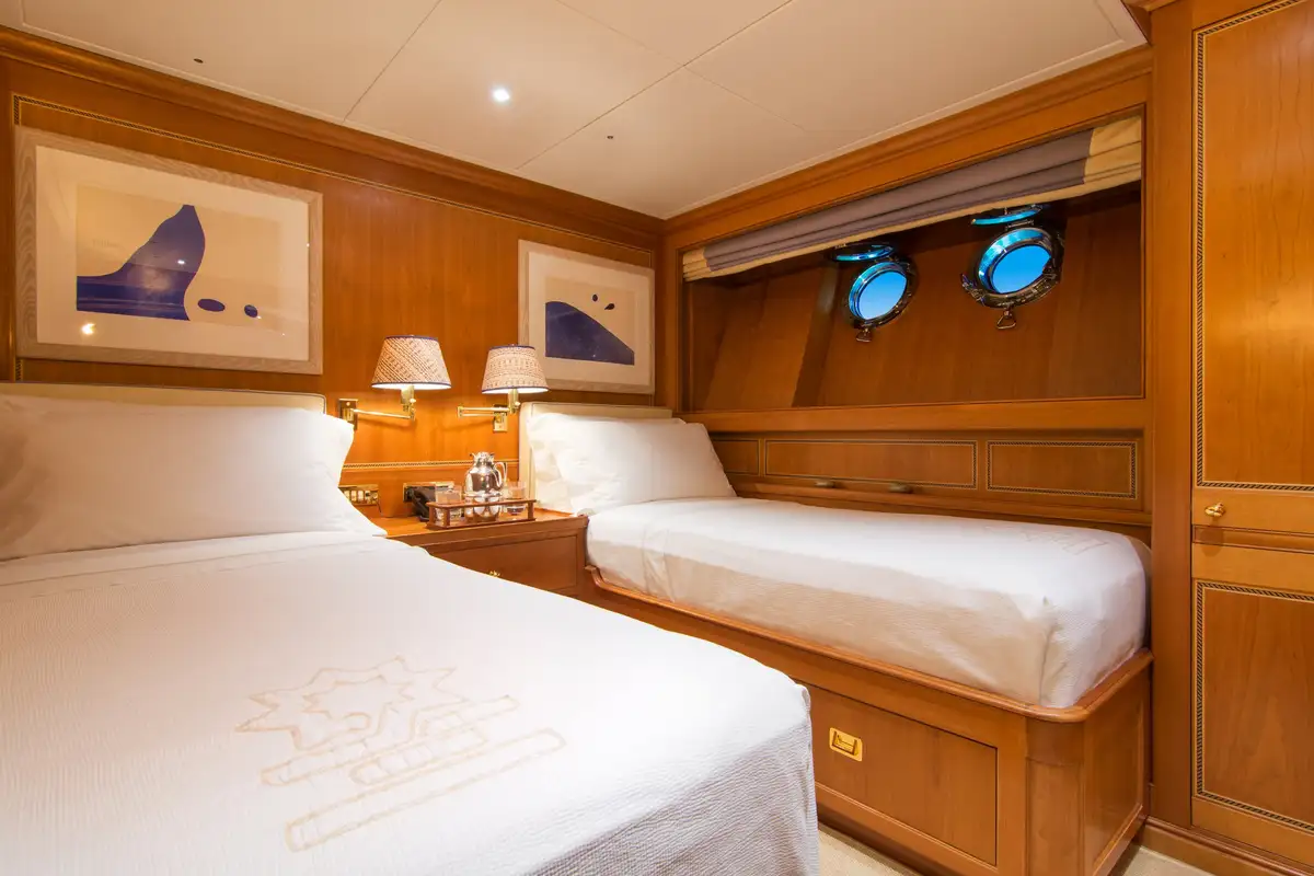 Five large guest cabins are located on the lower deck. The spacious full beam owner's suite has an adjoining lounge and study together with ensuite his/her bathrooms, one with a tub plus there is a sauna. Additionally there are two double and two twin guest cabins (both twins have additional pullman beds), all with ensuite facilities.