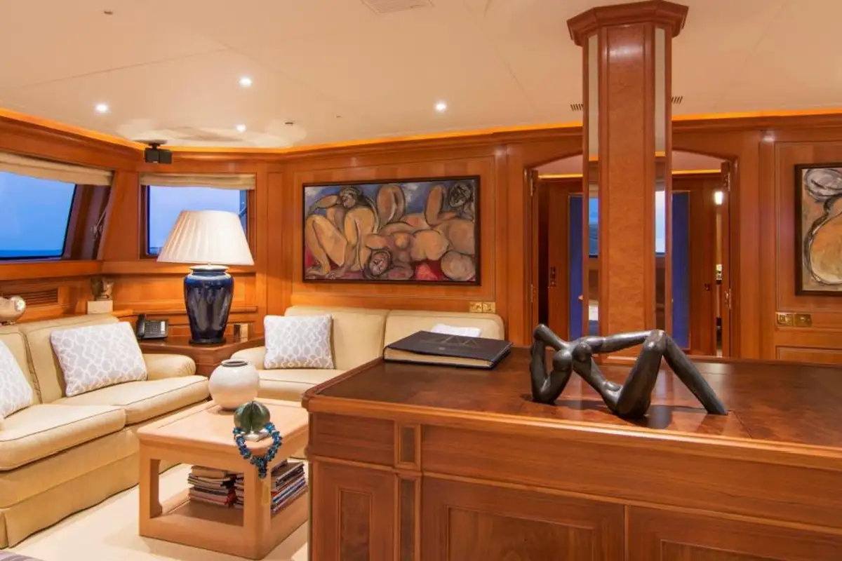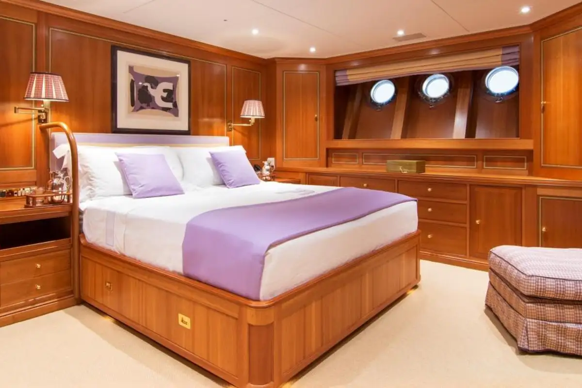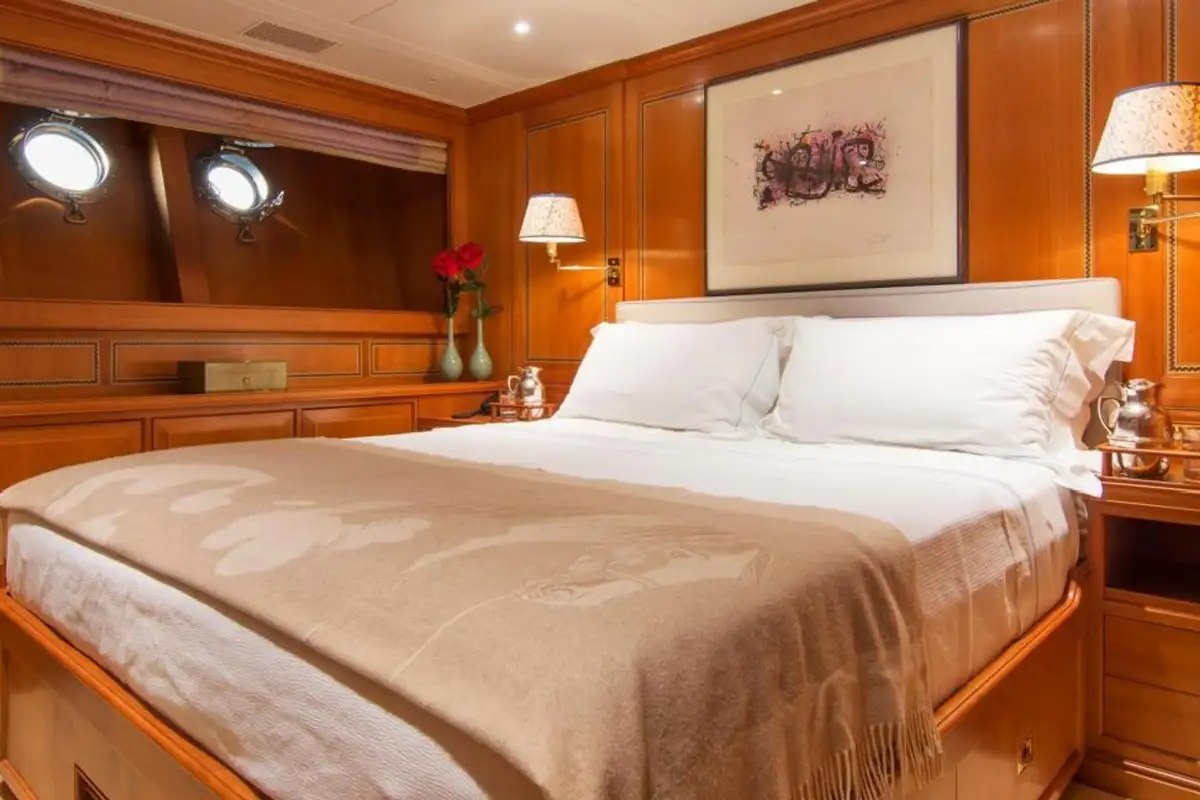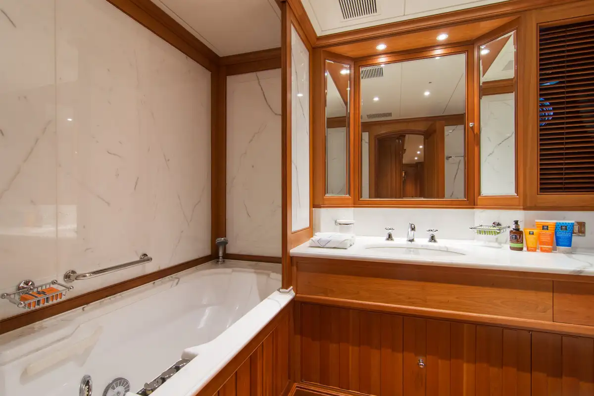 Five large guest cabins are located on the lower deck. The spacious full beam owner's suite has an adjoining lounge and study together with ensuite his/her bathrooms, one with a tub plus there is a sauna. Additionally there are two double and two twin guest cabins (both twins have additional pullman beds), all with ensuite facilities.