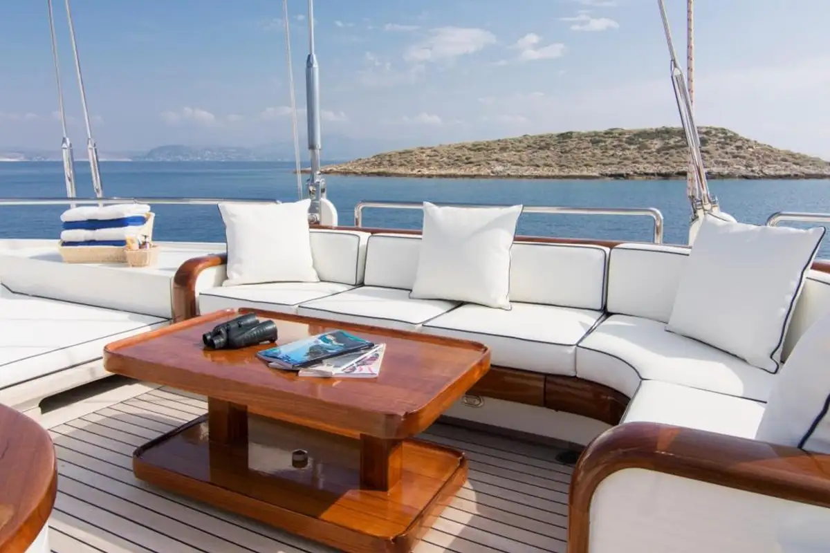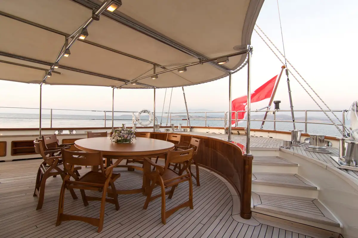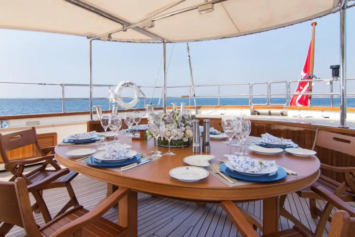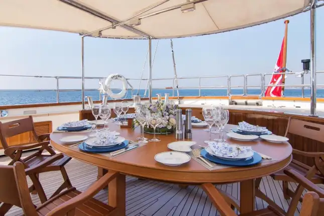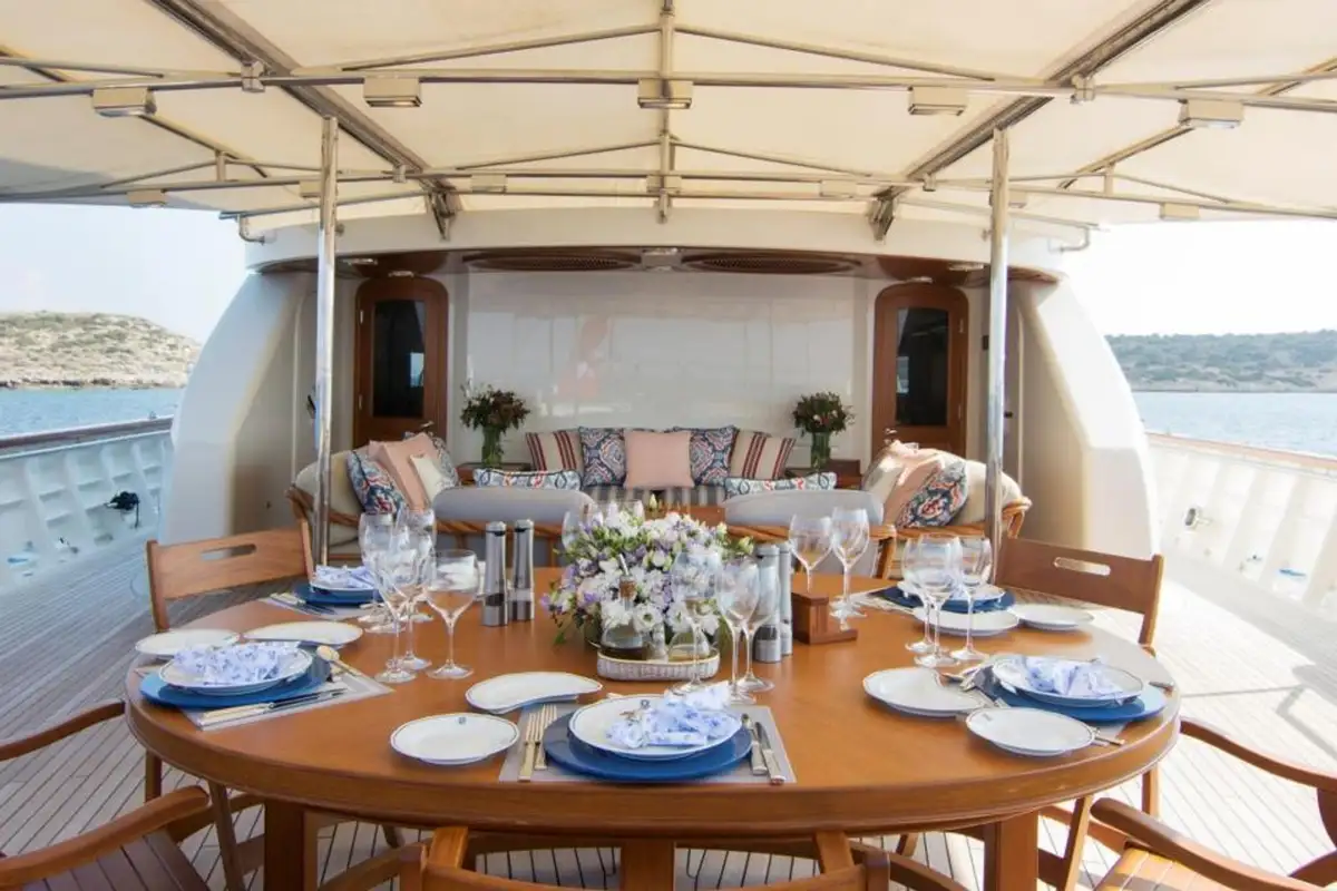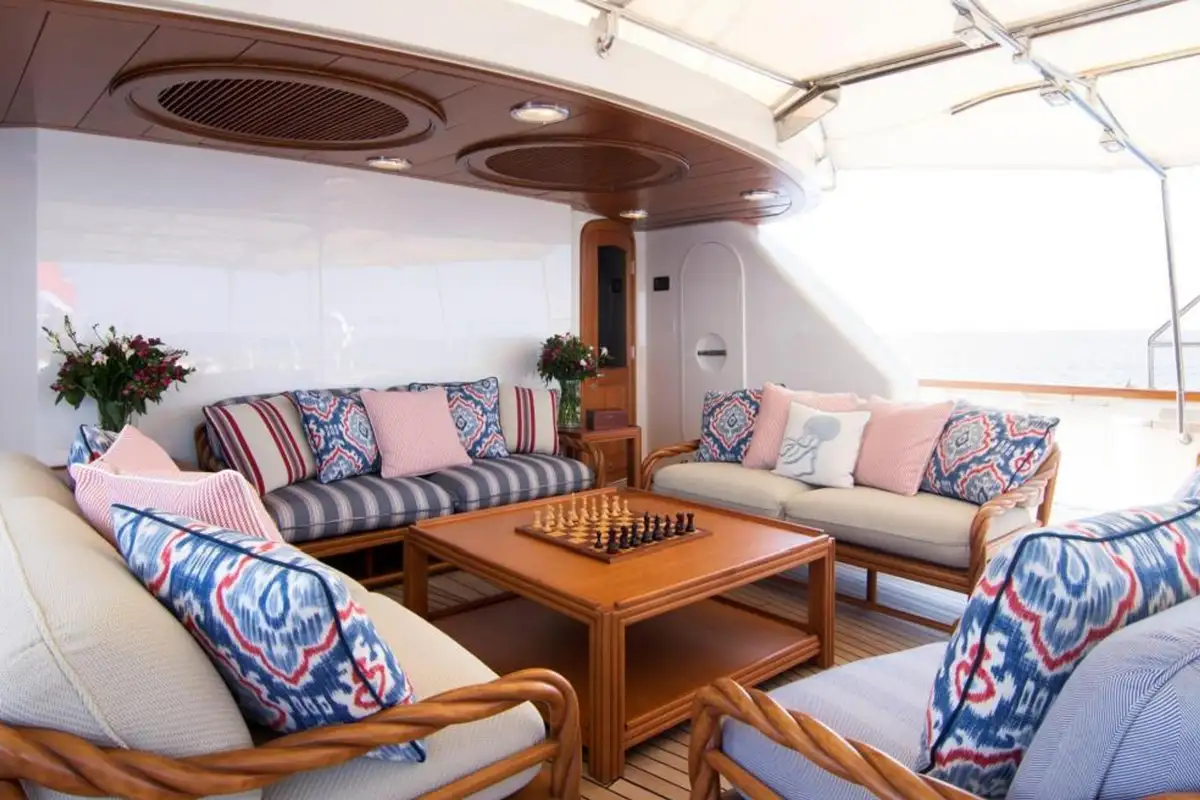 On the main deck aft, a large round dining table seats 12 guests in a shaded setting, whilst a low seating sofa arrangement compliments the charming feel of this area.