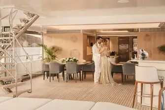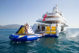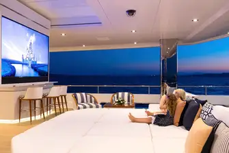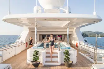Designed for outdoor living, 73m (239.6ft) TITANIA features wide deck spaces for lounging and relaxing while cruising the Mediterranean. Picture yourself gliding through the clear waters sitting at the pool deck bar or in the pool itself, accompanied by chilled tunes from the DJ set up. Once anchored, head down to her beach club, complete with sauna, for easy access to an array of watertoys. Along with her many toys, including scuba diving equipment, an inflatable waterslide and inflatable waterpark, TITANIA is also a certified RYA Training Centre, and has two qualified jet ski instructors within the crew. If this all seems too active for you, simply head to the dedicated spa room for a massage from the fully qualified on board therapist.