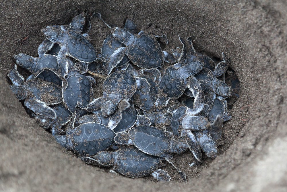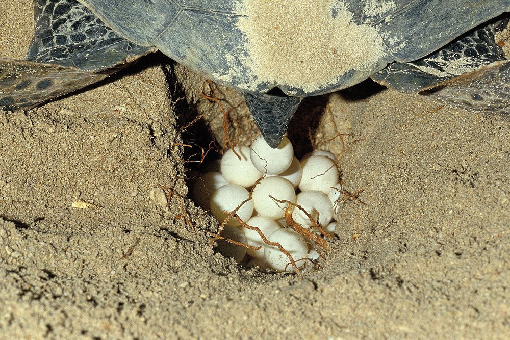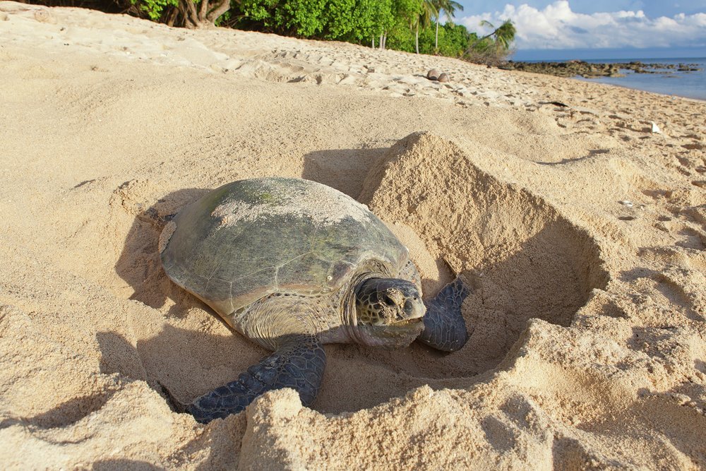 The first few weeks of life are the hardest for the hatchlings due to predation from birds and sea life, and the odds are stacked against them with only 1 in 1,000 turtles reaching maturity. After successfully leaving the nest and making it into the Coral Sea the baby turtles will spend years in open ocean, before returning to the coastal shallows. Mature turtles will breed and nest every three to seven years and the females climb back up the beach in the late afternoon and evening to dig their nests and lay a first clutch of approximately 100 eggs. During the season the females will climb out five more times to lay eggs and at the height of the season over 10,000 nesting turtles will make their way up beach each night. With such a plentiful food source gathering in such a small area the turtles are not the only ones making large migrations, tiger sharks also descend on the island to pick off the weak or dying turtles.