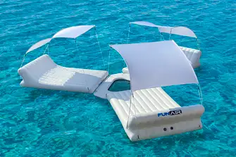 'Superyacht owners love the flexibility of our modular beach furniture products,' says FunAir’s Managing Director John Courtney. 'The Floating Shaded Island takes this concept to the next level. You can use the double shaded lounger on the beach, in the shallows, on the deck, or tethered from the swim platform out at anchor. You can even connect three loungers together to max out group relaxation.'