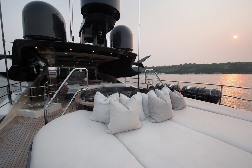 ‘The flybridge is the perfect space to watch the sunset. The open-air lounge has two TVs and provides shade and comfort, the aft jacuzzi is the best place for taking in the scenery while enjoying a sundowner.