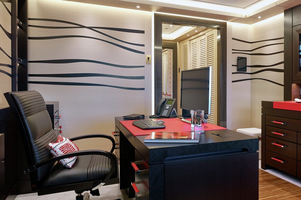 The VVIP suite is on the bridge deck above, facing aft onto a private terrace and on over the huge upper deck aft to the anchorage beyond, spectacular views. The remaining seven dedicated cabins are forward on the main deck, including two VIP suites with their own folding balconies, and two further rooms are convertible as guest cabins.