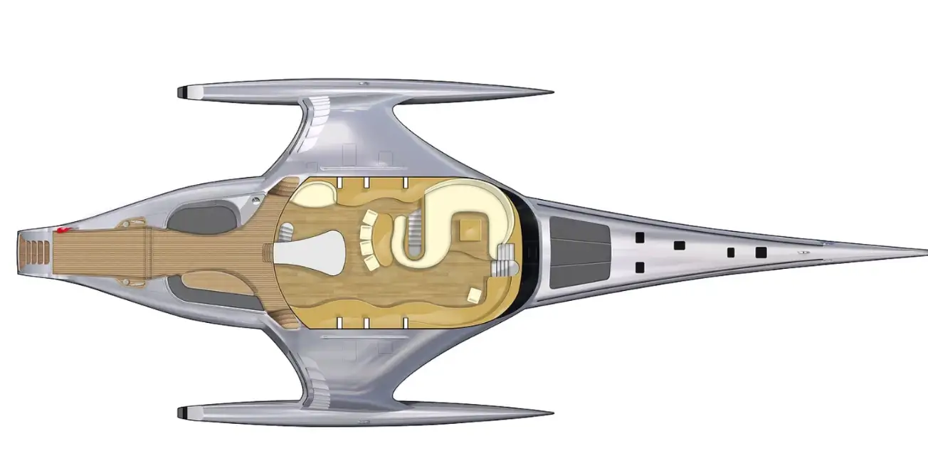 Built for adventuring, a shallow draft of 1.2m (3.9ft) means the vessel can explore a wider range of harbours and islands than larger, more traditional yachts. A 16m beam offers a cleverly designed and light-filled interior that feels spacious, with spectacular views through the panoramic windows. The foredeck has a large area for sunbathing, and the artfully designed garage door folds out to form a large diving platform.