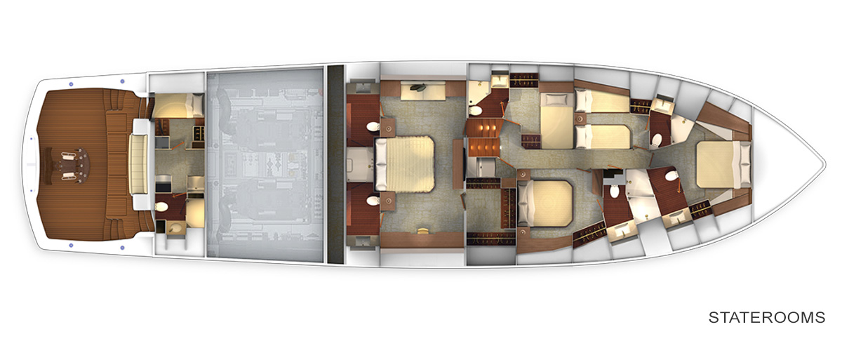 The flybridge offers quiet and protected cruising in any weather to reach those uncharted fishing destinations. Aft of the helm station is a sky lounge with a comfortable seating area surrounded by panoramic views. The flybridge aft offers an additional helm station with outriggers and additional rod holders.