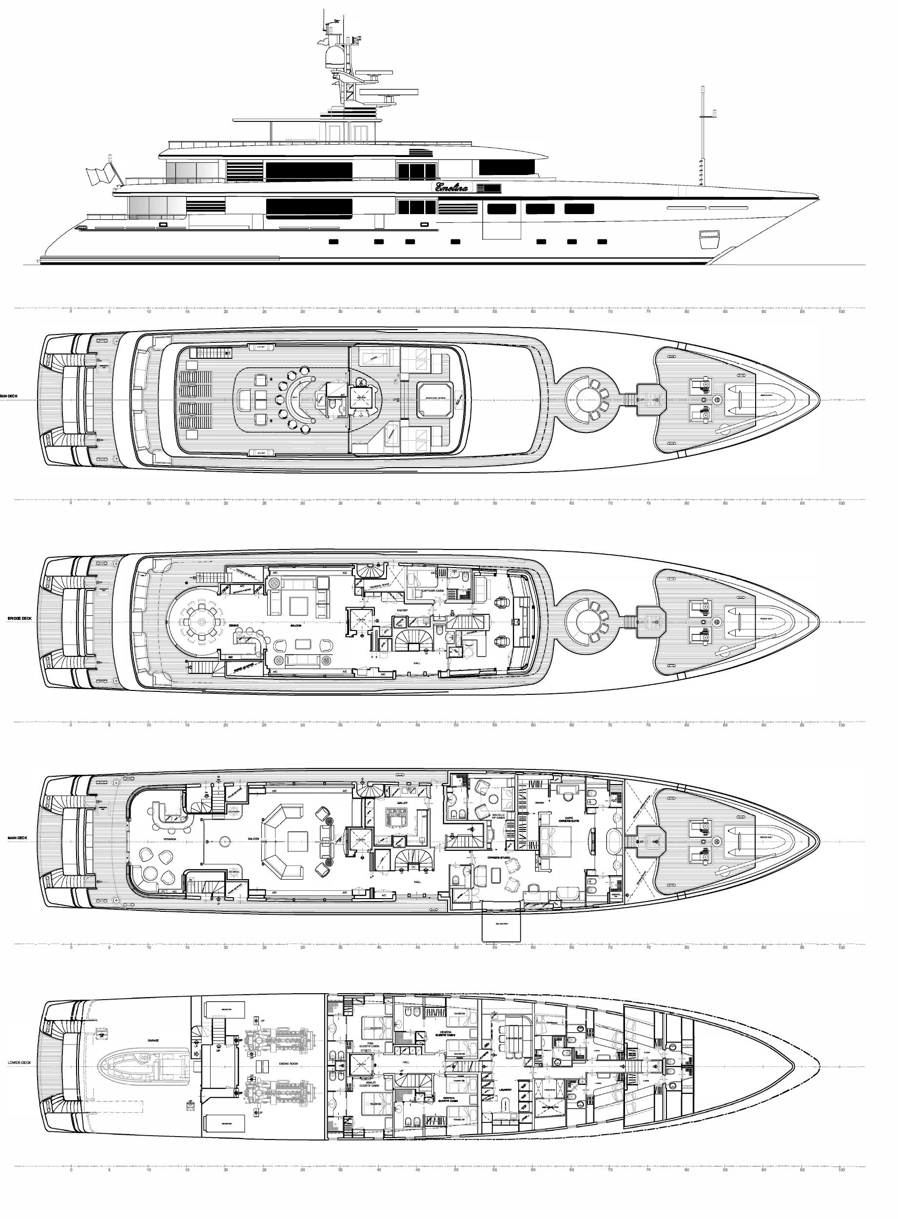 - Elevator through four decks from lower guest cabins to sun deck