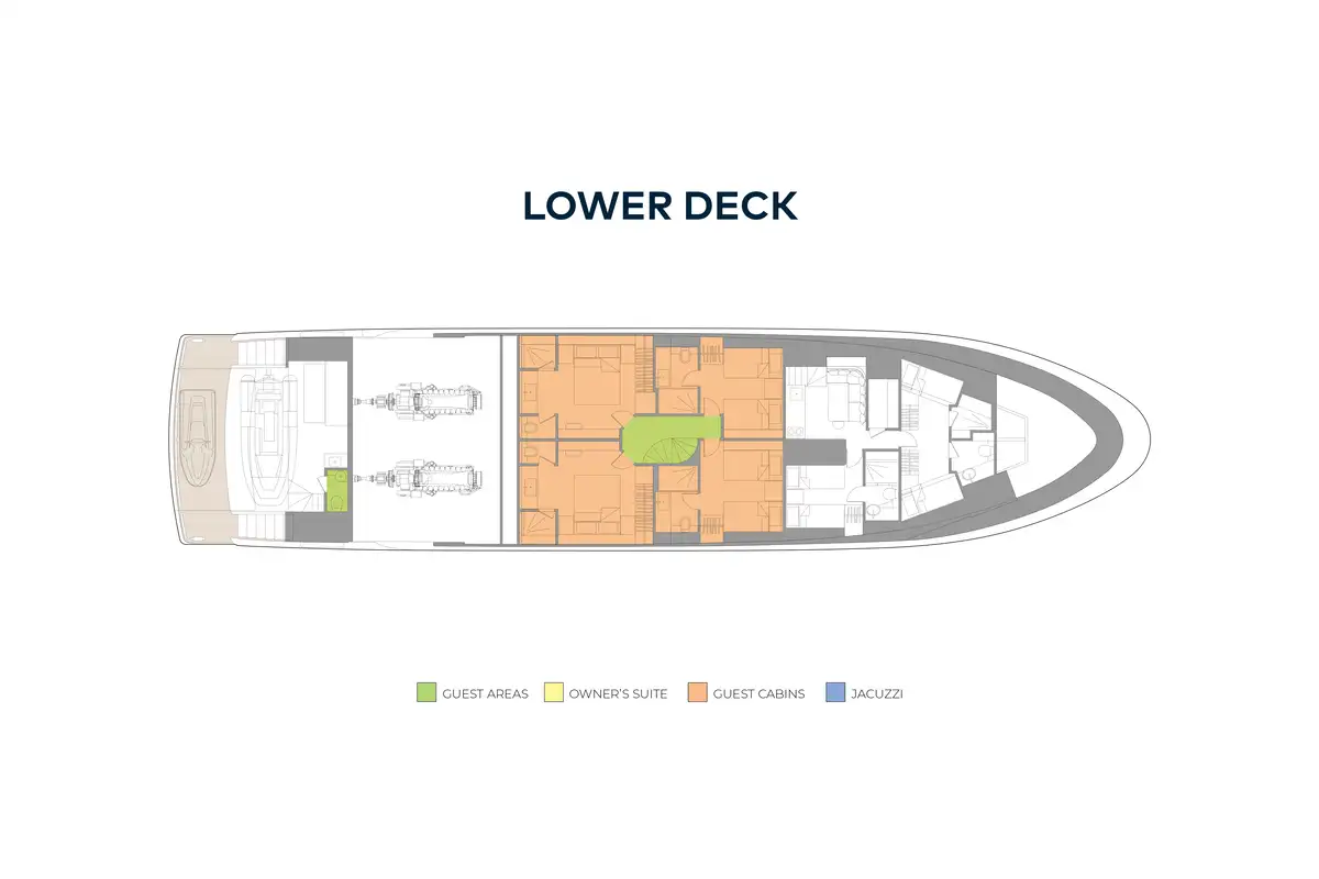 The owner's suite, forward on the main deck, is well lit through large windows port and starboard and two circular skylights. There is a walk-in wardrobe and steps forward lead down to a marble bathroom with shower and bath. On the lower deck are two double guest suites and two twin guest suites, both of which have an additional berth, completing accommodation for 12 guests in five suites.